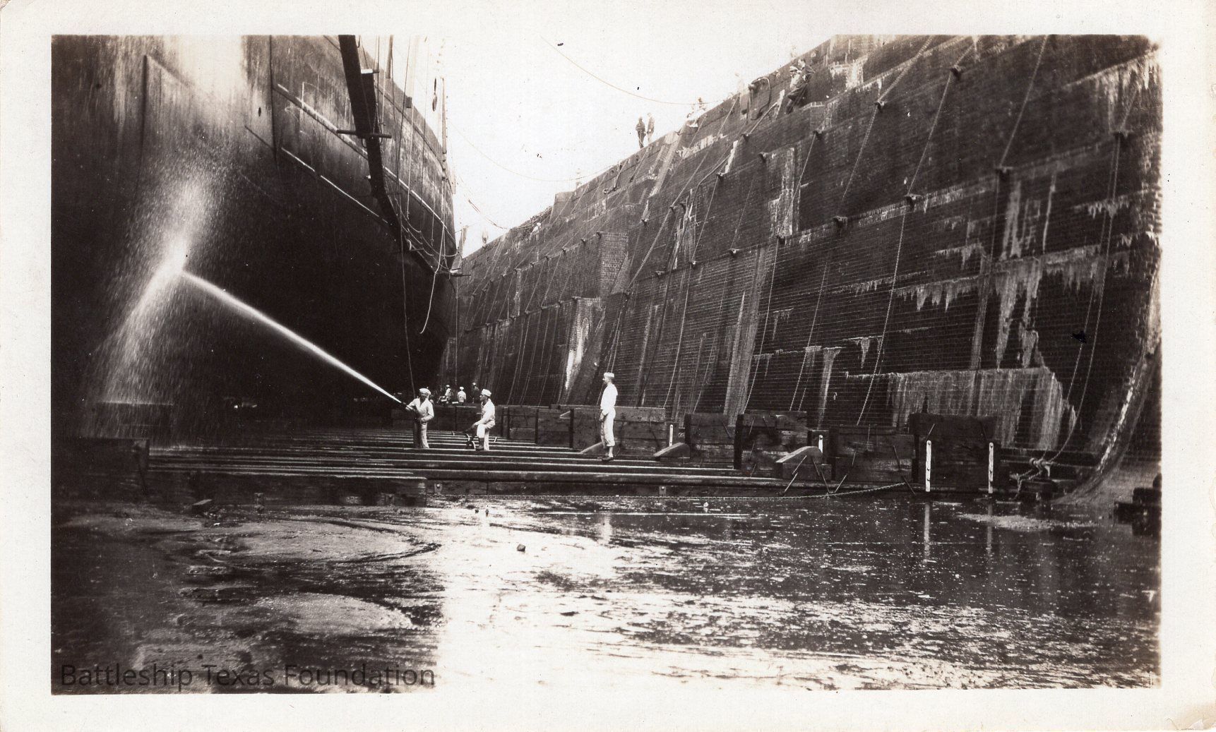 Three men in foreground. One with hose washing TEXAS hull in dock. Two men in background.