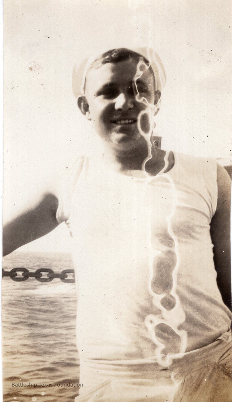 Features a man posing on and leaning on a chain railing. Water damage in a vertical line along the left side of the sailor's face.Context