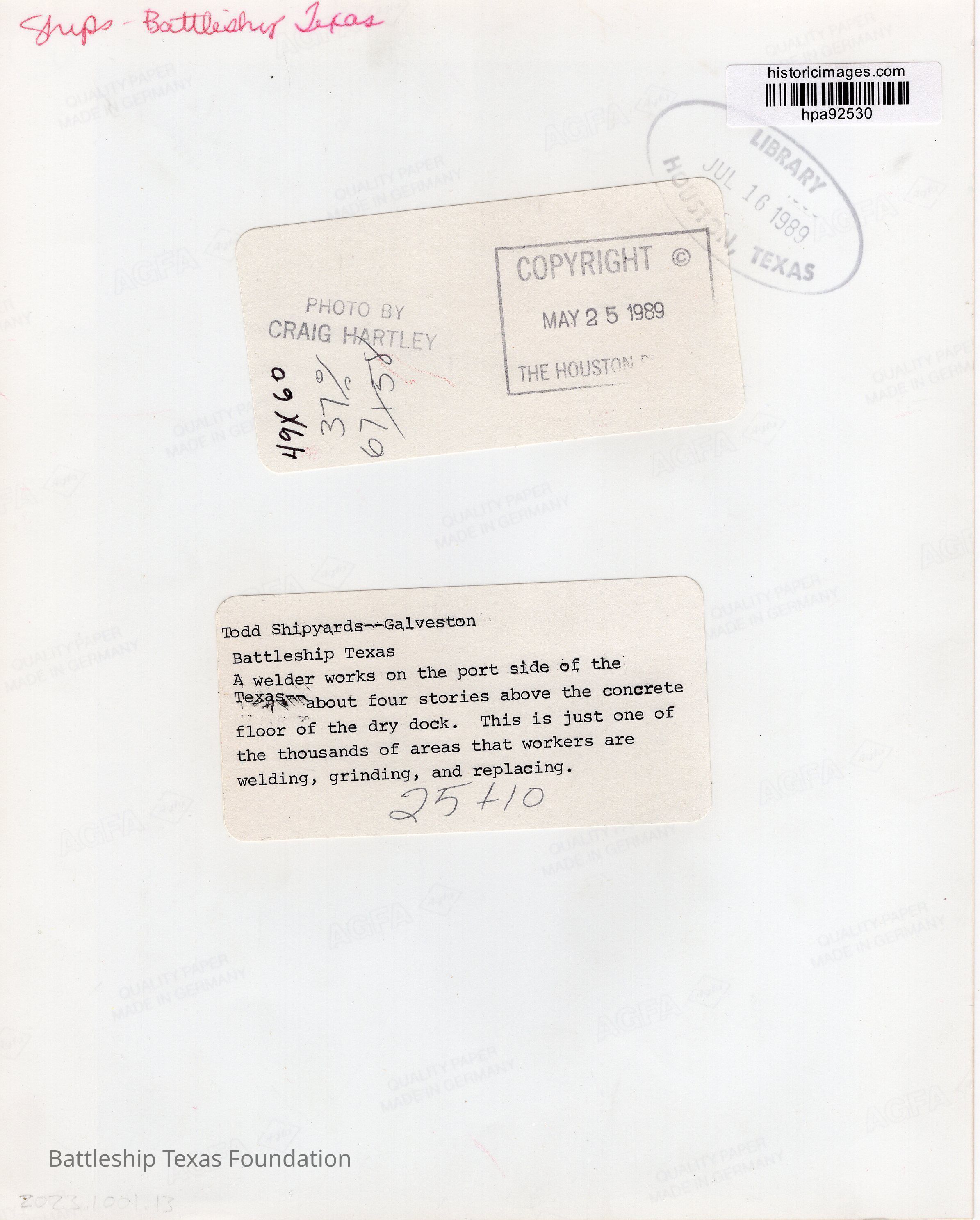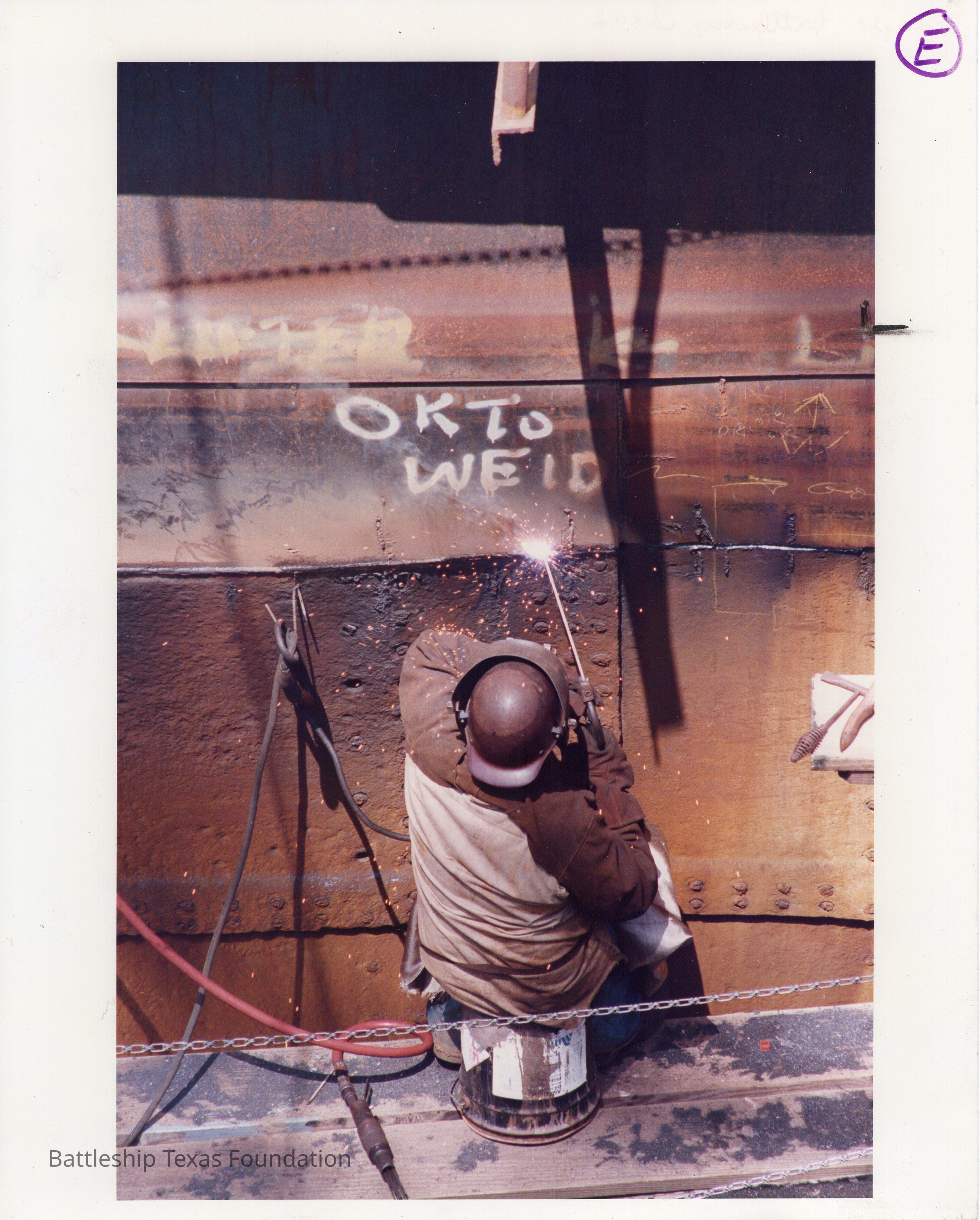 A welder works on the port side of the Texas--about four stories above the concrete floor of the dry dock. This is just one of the thousands of areas that workers are welding, grinding, and replacing."Context