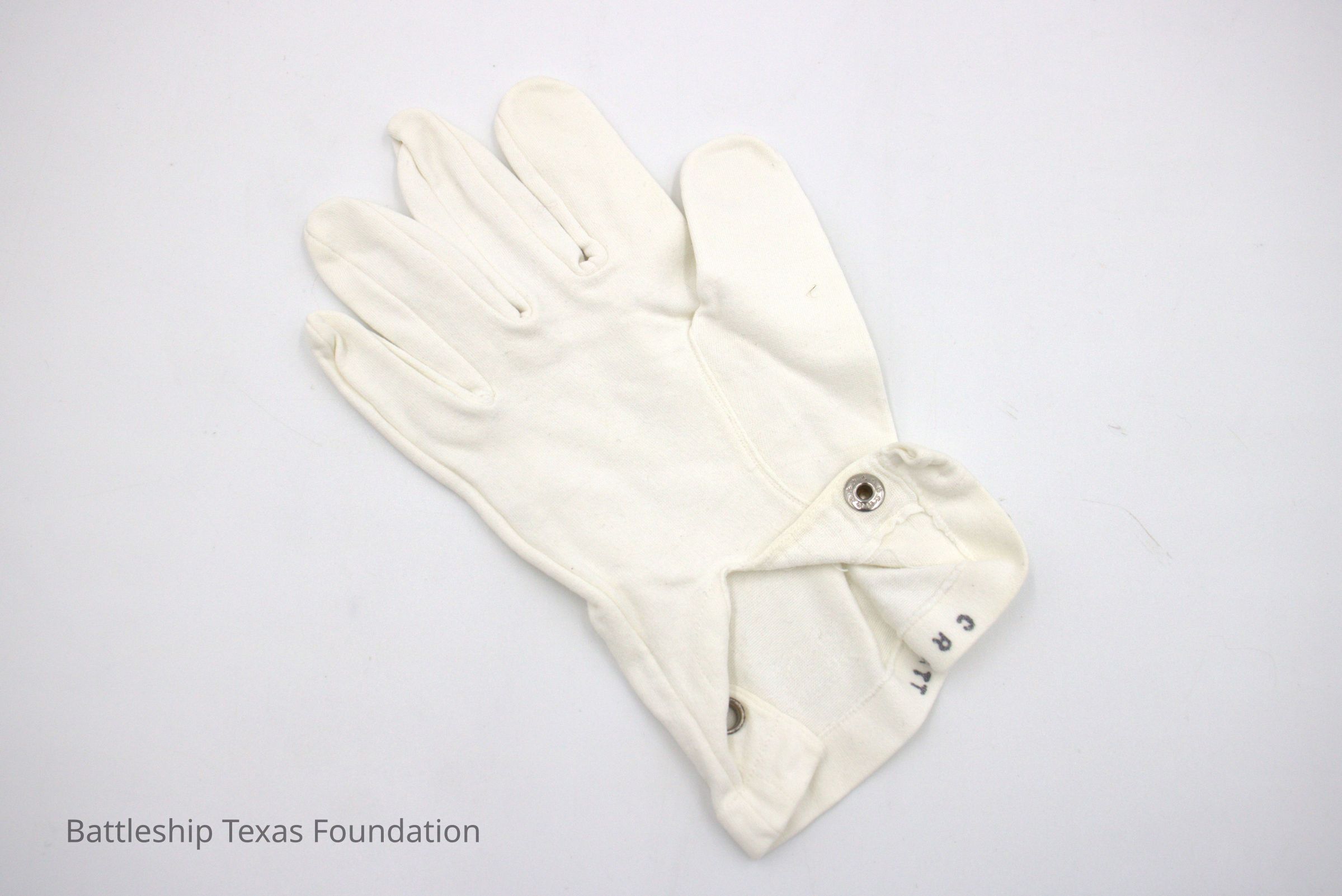 Shorter white gloves with metal clasp on the wrist. Both gloves have "C R Pratt" on the bottom of the glove.Context