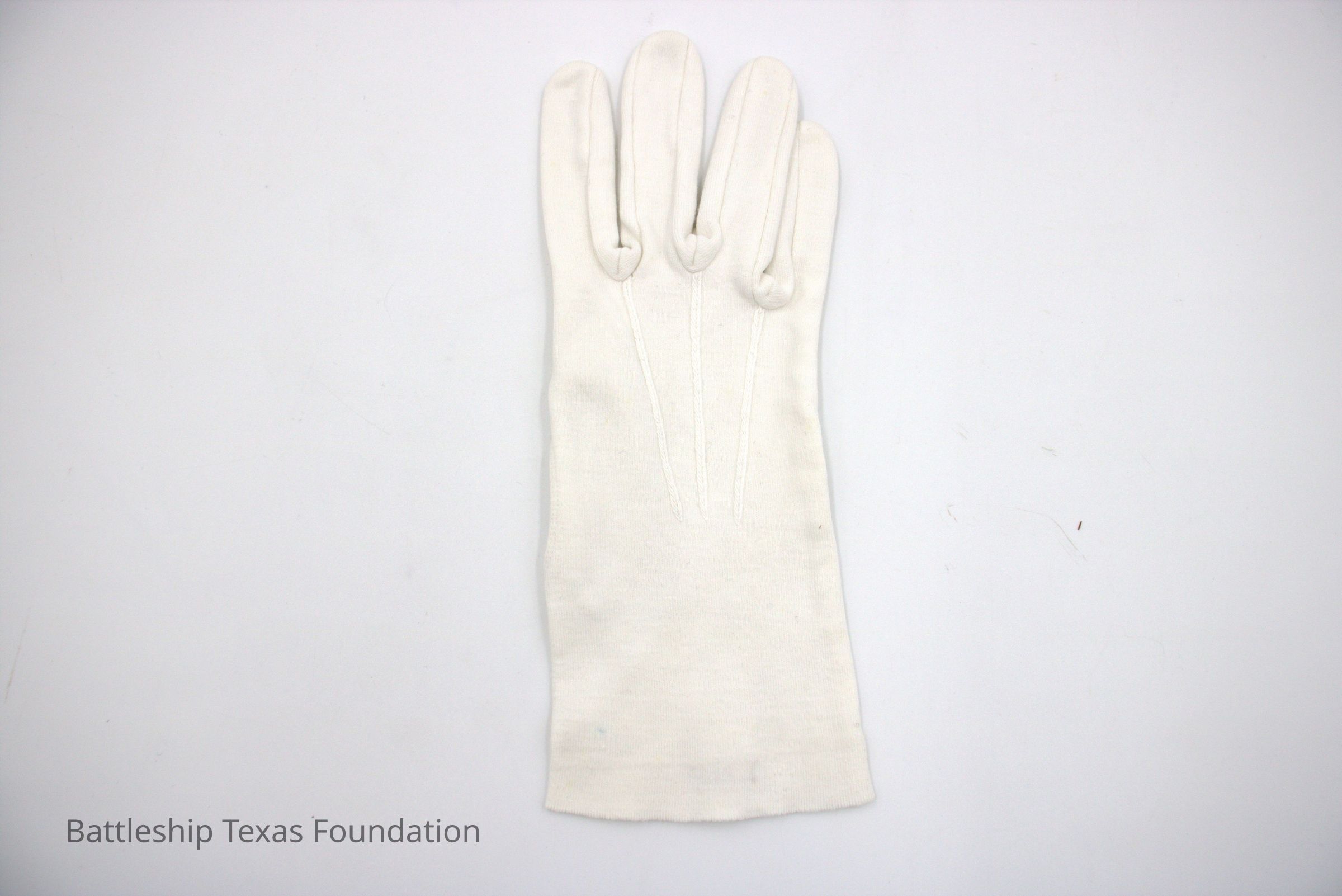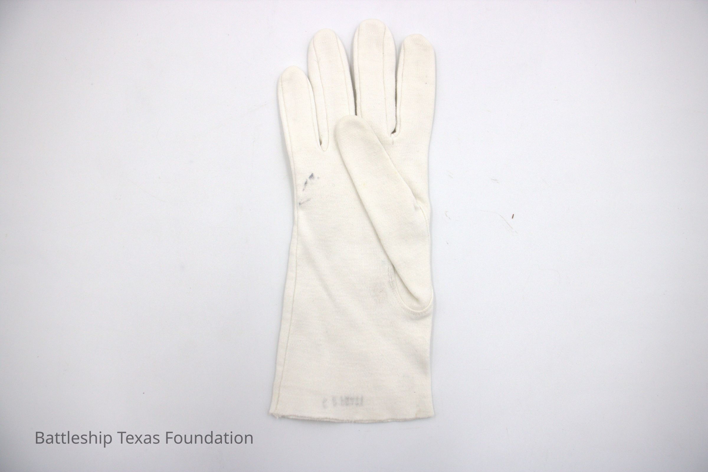 Single white glove without slit or buttons. Cut and frayed at the bottom with name stamped. No left hand version in collection.Context