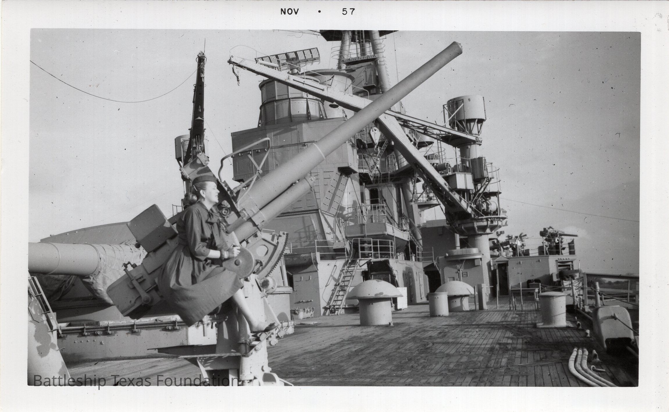 Woman aims one of the aft starboard 3"/50cal guns. Top of the photograph dates the image to November 1957.Context