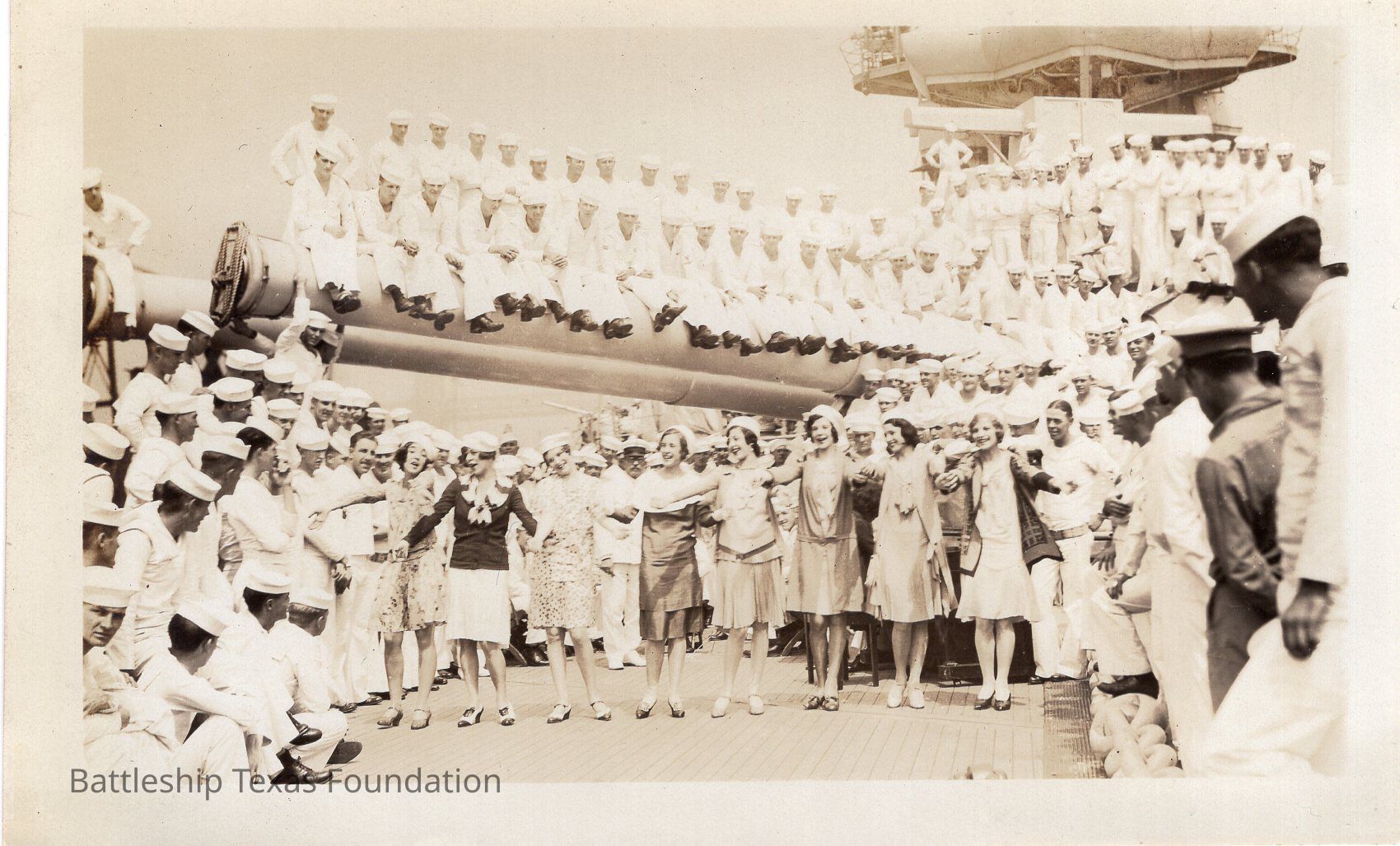 Men gather on turrets and around deck as women in dresses dance in a line.Context