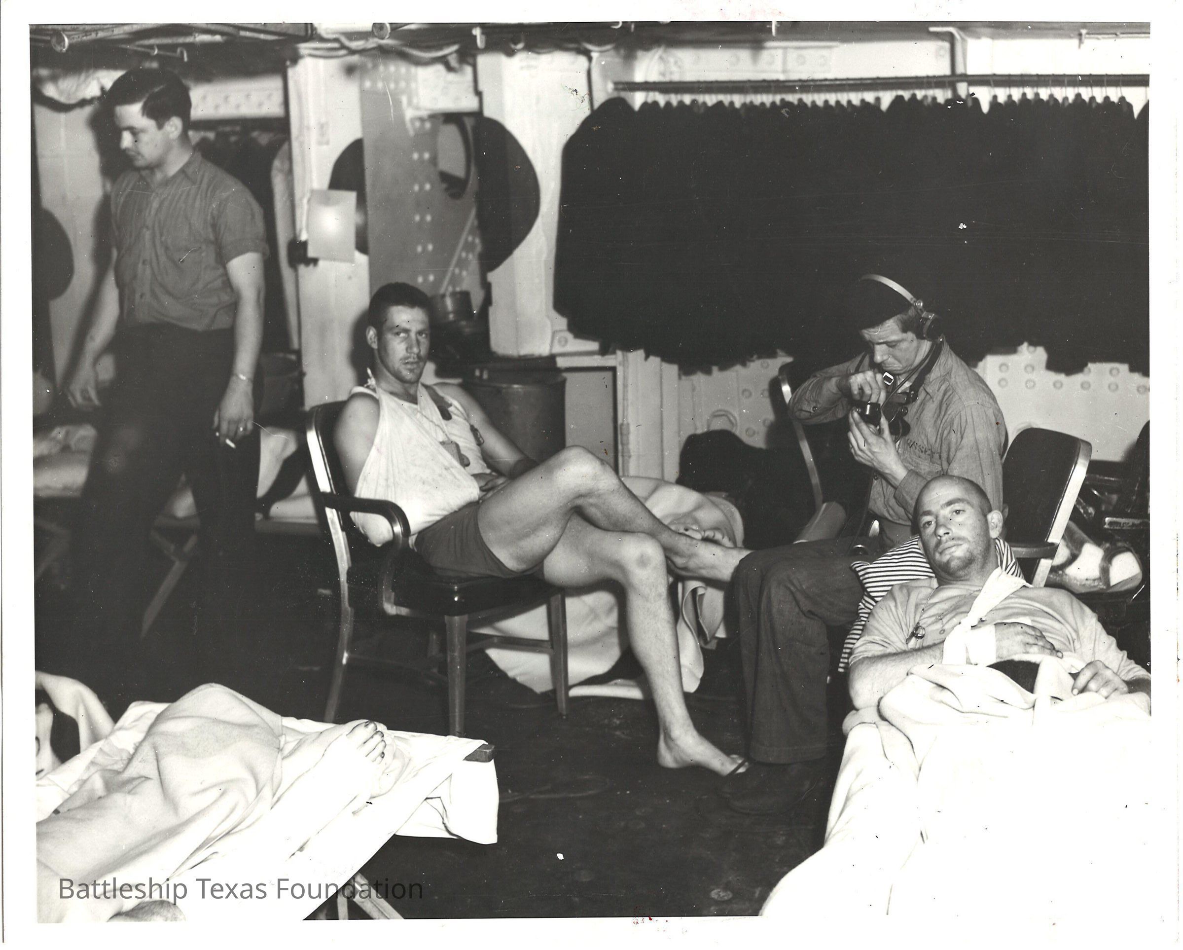 Houston Chronical copy of a Navy photo of wounded Rangers inside Casemate 3 on Battleship Texas. At left is sailor standing with a cigarette. To his right is a Ranger sitting in a chair with his legs crossed (center of picture). At right is sailor sitting wearing a pair of sound powered headphones and an wounded Ranger on a cot looking at the camera. In the background, peacoats are hanging on a rod against the outboard bulkhead of the ship.