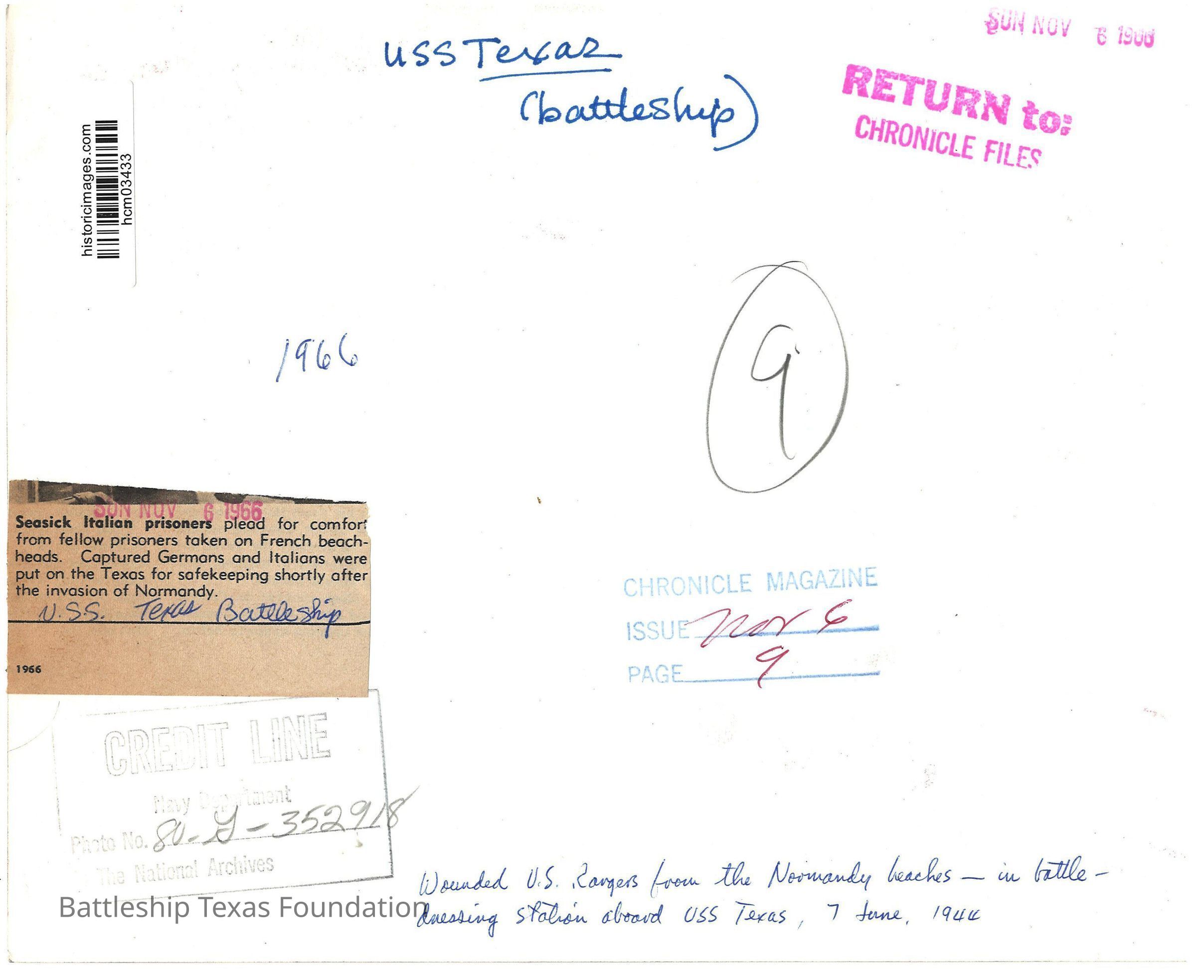 On the back of the image, handwritten is "USS Texas / (battleship)" , "1966", "9", and "Wounded US Rangers from the Nomand beaches - in battle - / dressing station aboard USS Texas, 7 June 1944." which is circled. Stamped ink is "SUN NOV 61966" and "RETURN TO: CHRONICLE FILES". At bottom is a photo caption from a newspaper glued to the back of the photo -the caption refers to captured German and Italian soldiers who were housed on the Battleship Texas as POWs at D-Day. Below that, is stamp crediting the Navy Department and giving the National Archives photo number as 80-G352918,Context