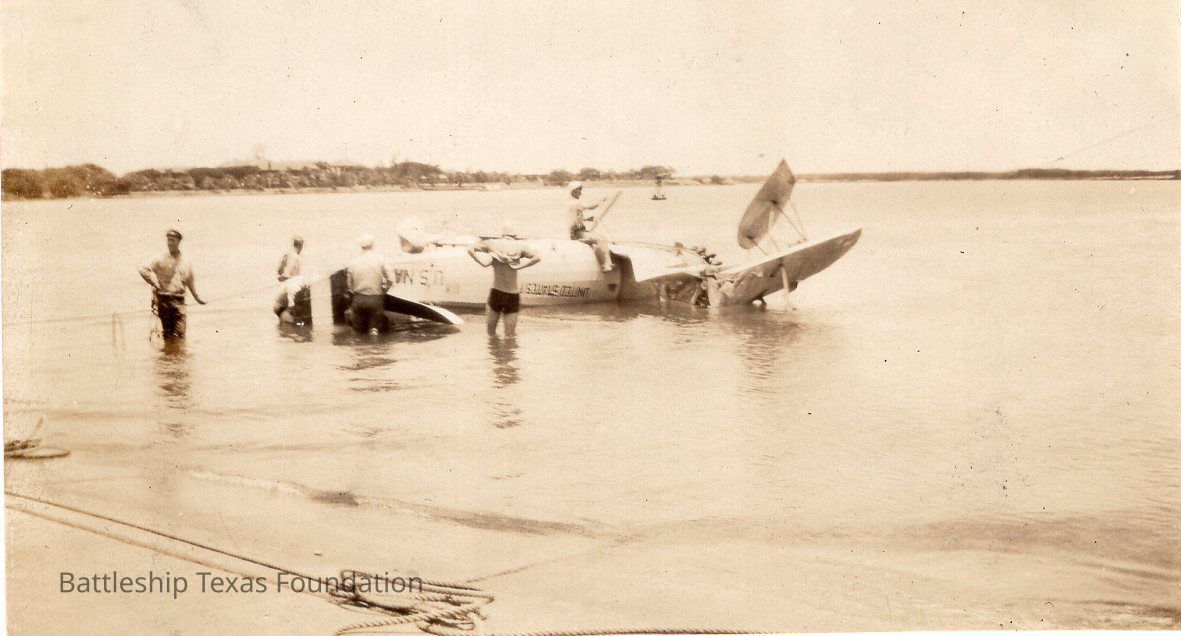 Texas spot plane wrecked in water. Five men work around it to pull to shore.Context