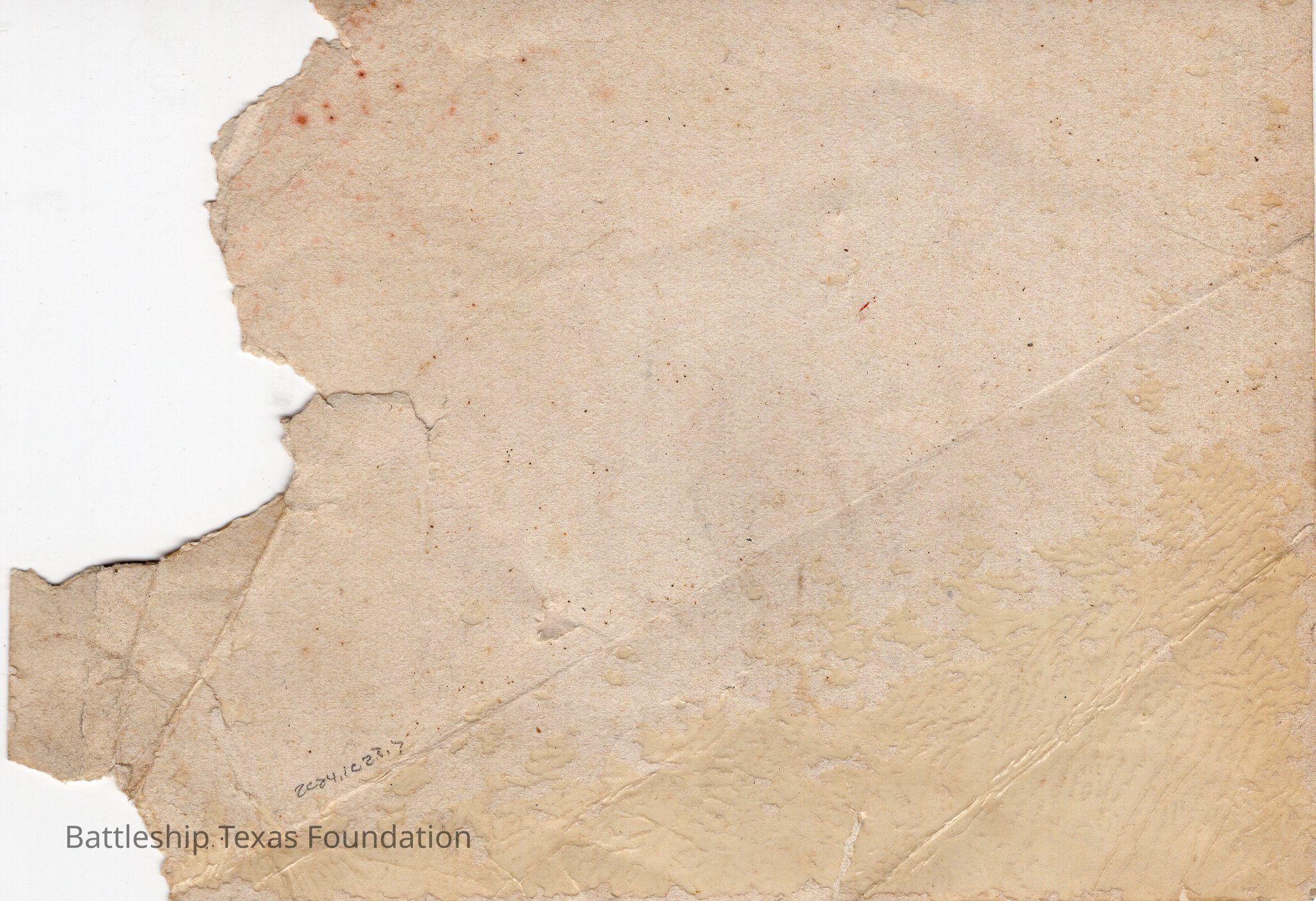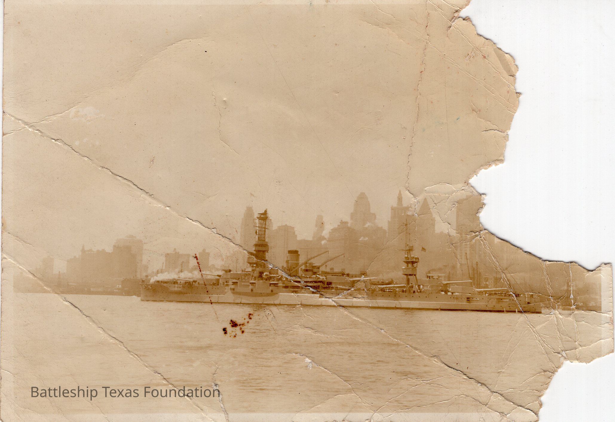 Heavily torn photograph of a Wyoming class battleship in New York Harbor. Cage foremast and tripod mainmast.Context
