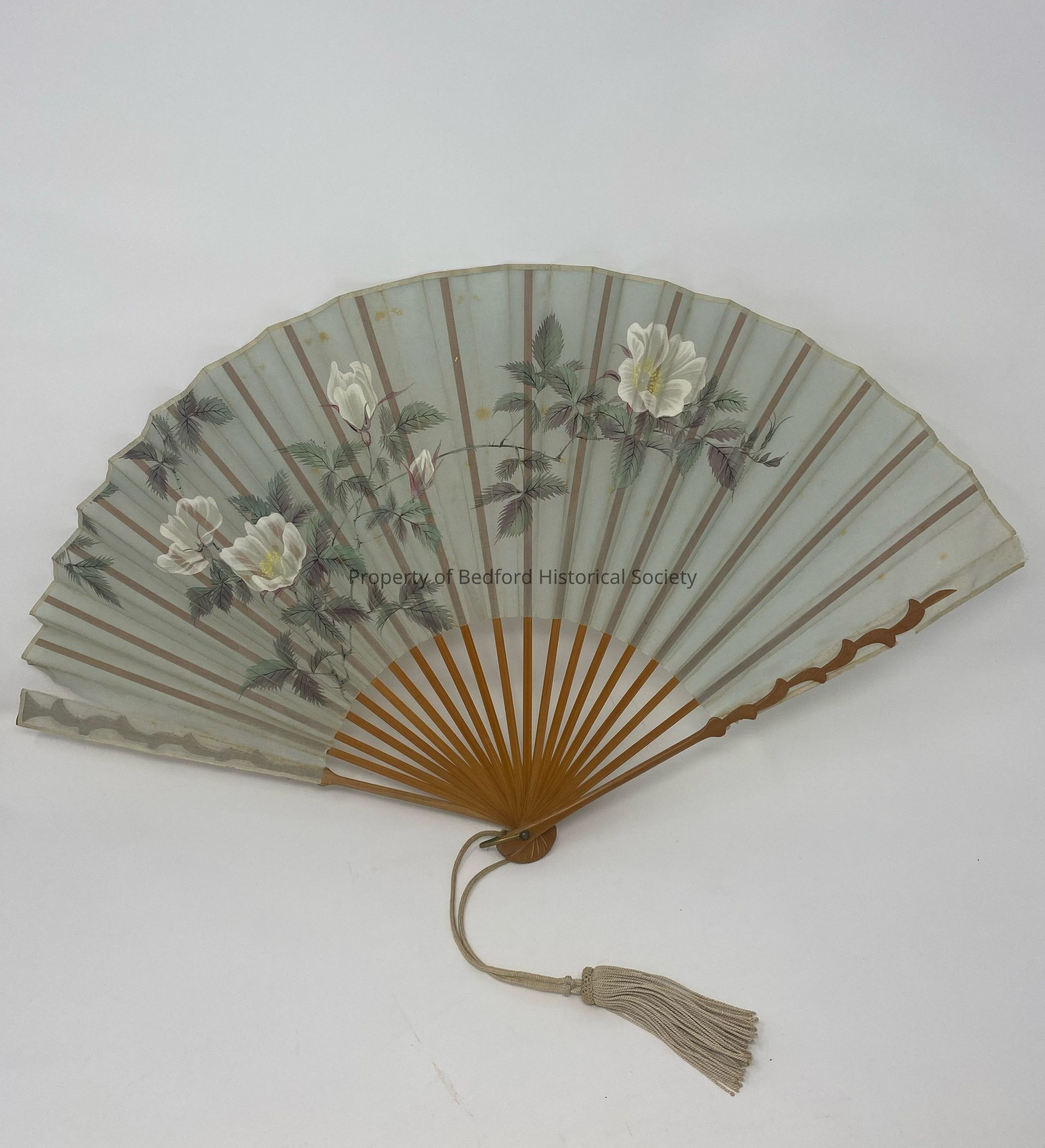 greyish-green silk and wood Asian inspired fan with hand painted white flowers