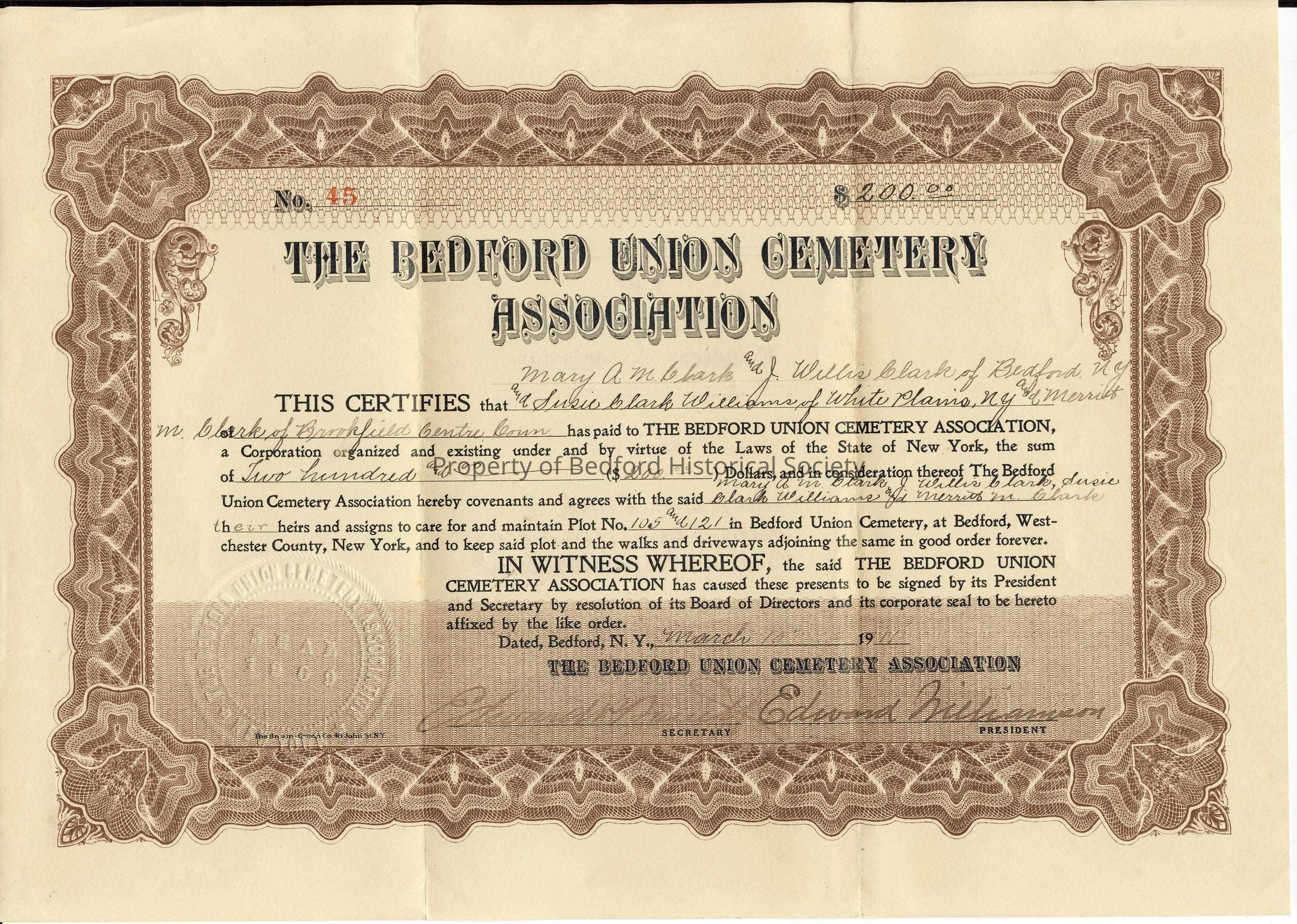 Certificate of ownership of two cemetery plots issued to Mary A.M. Clark, J. Willis Clark, Susie Clark Williams, and Merritt M. Clark, for plot #105 and #121, dated March 10, 1911.
