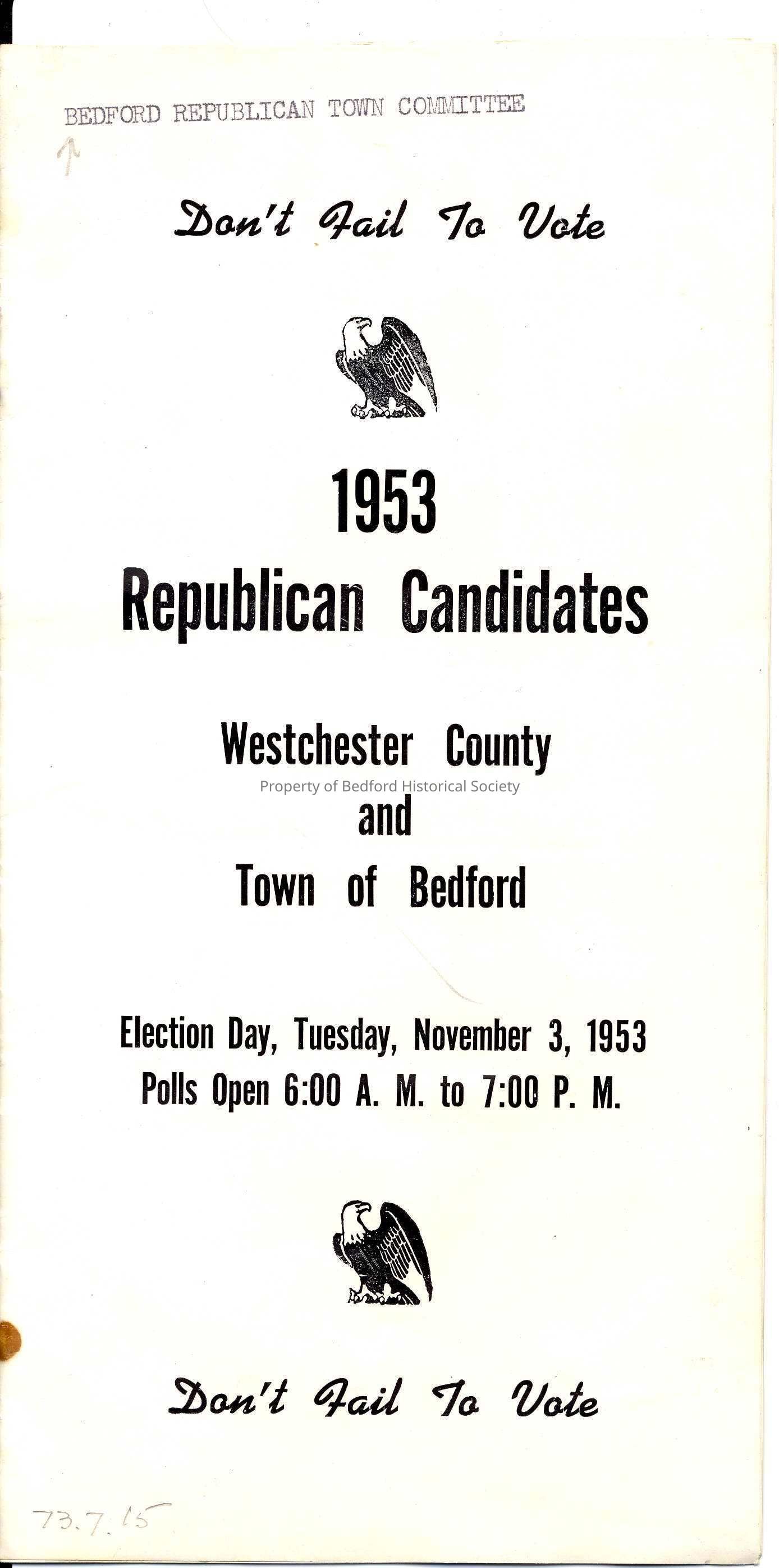 1953 Republican Candidates, Westchester County and Town of Bedford published by the Bedford Republican Town Committee