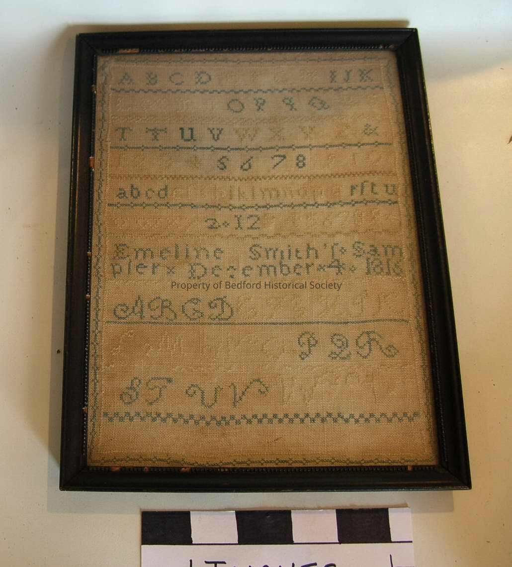 Catalogue card: Sampler made at age of 10 in 1816 by Emaline Smith Clark, daughter of Henry and Mehitabel Smith of New Castle and second wife of Jeremiah Clark whose farm is now (1966) the property of Allan J. Mcintosh, South Bedford Road, Bedford.