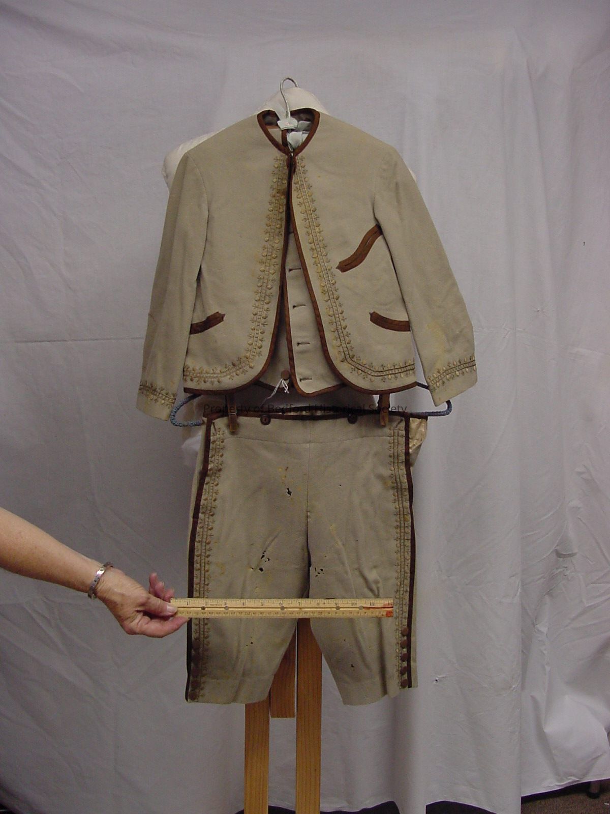 Boys three piece tan wool suit with Zouave jacket buttoned at neck, brown pocket details, and gold braided trim around front and cuffs. Matching vest and pants.