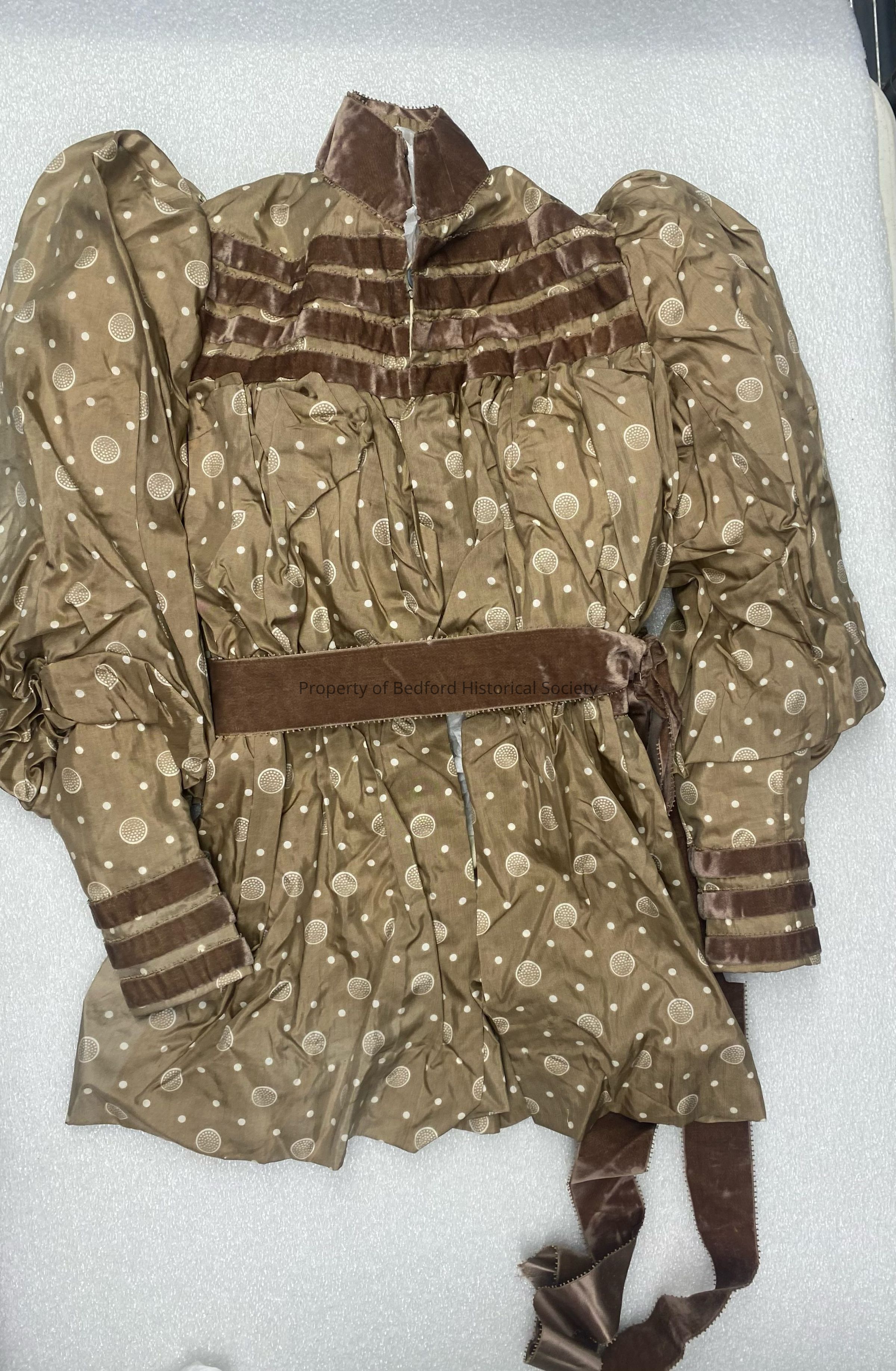 Brown silk top with white dots design and brown velvet ribbon collar, upper chest, cuffs and waist