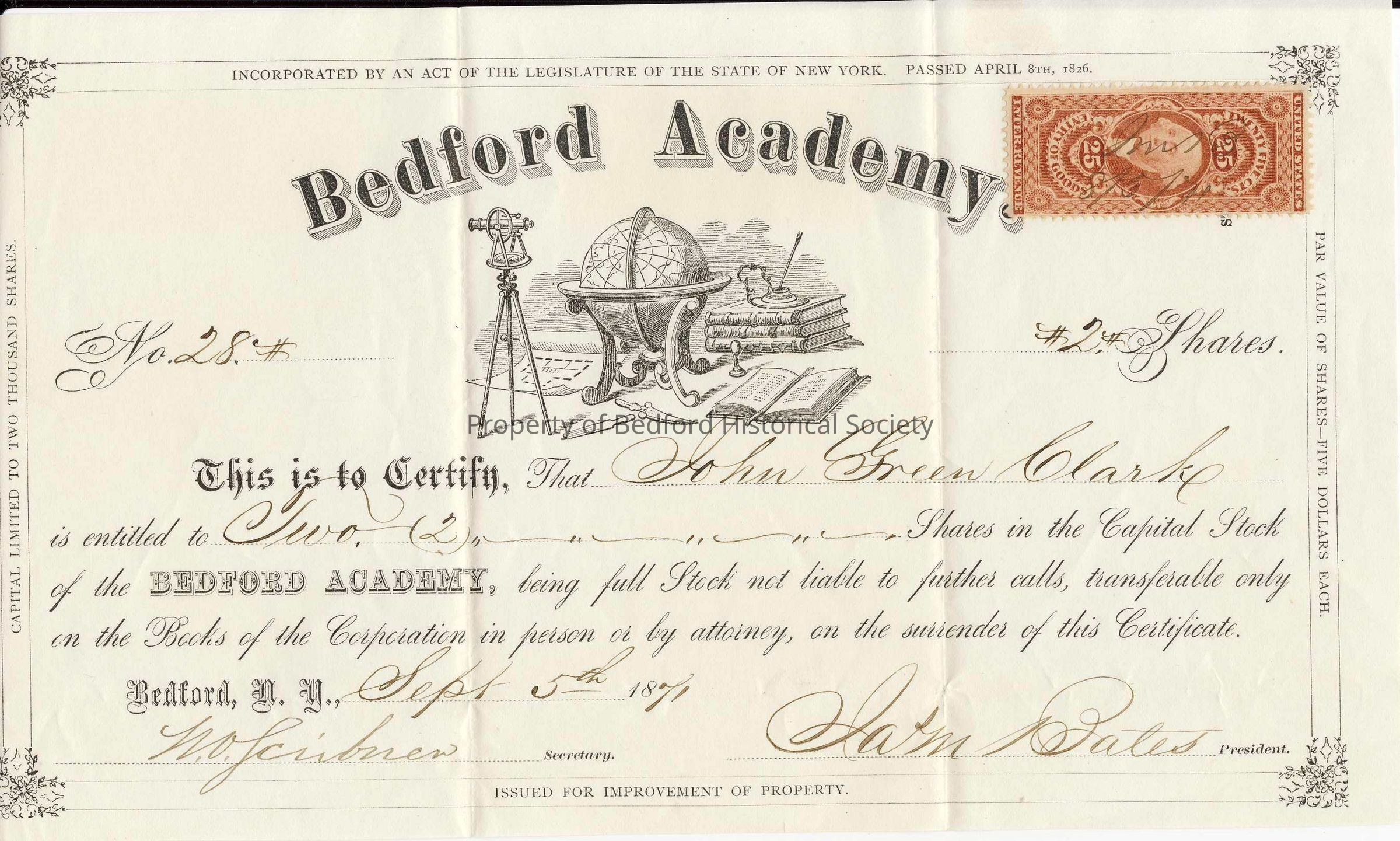 Certificate for two shares of stock in Bedford Academy made out to John Green Clark on September 5, 1871