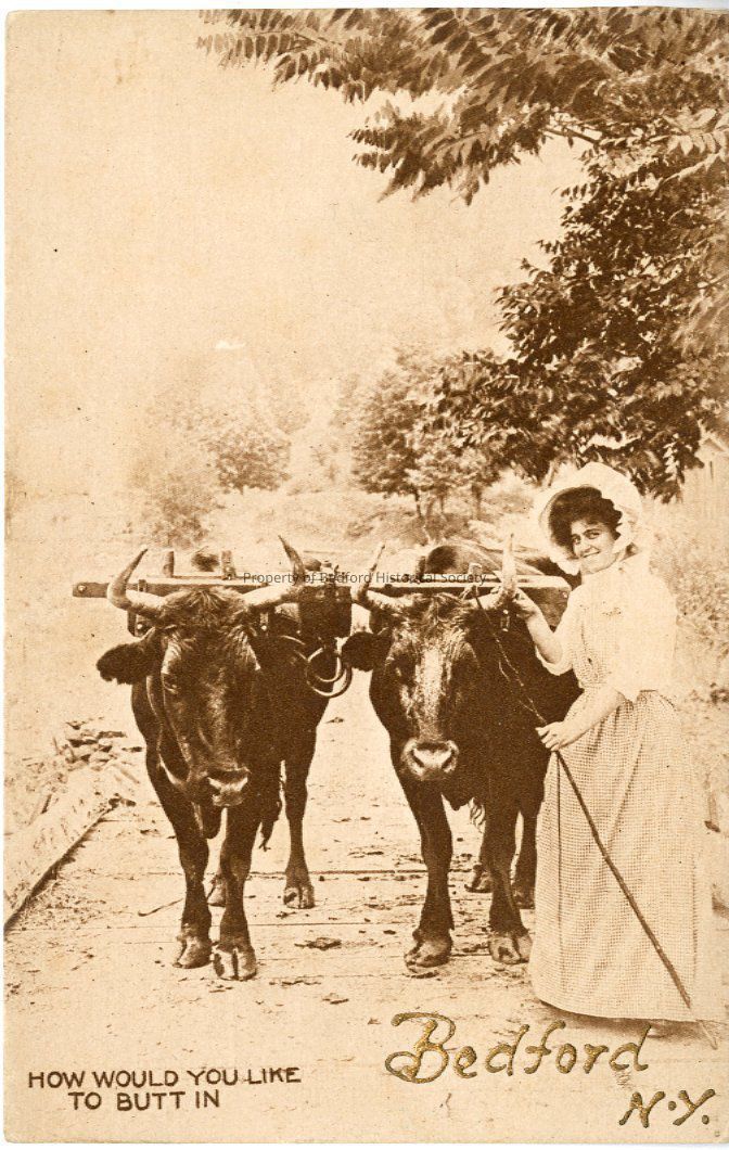 Vintage Bedford postcard (c. 1910s) of woman dressed as shepherdess with two oxen. Caption is "How would you like to butt in?"