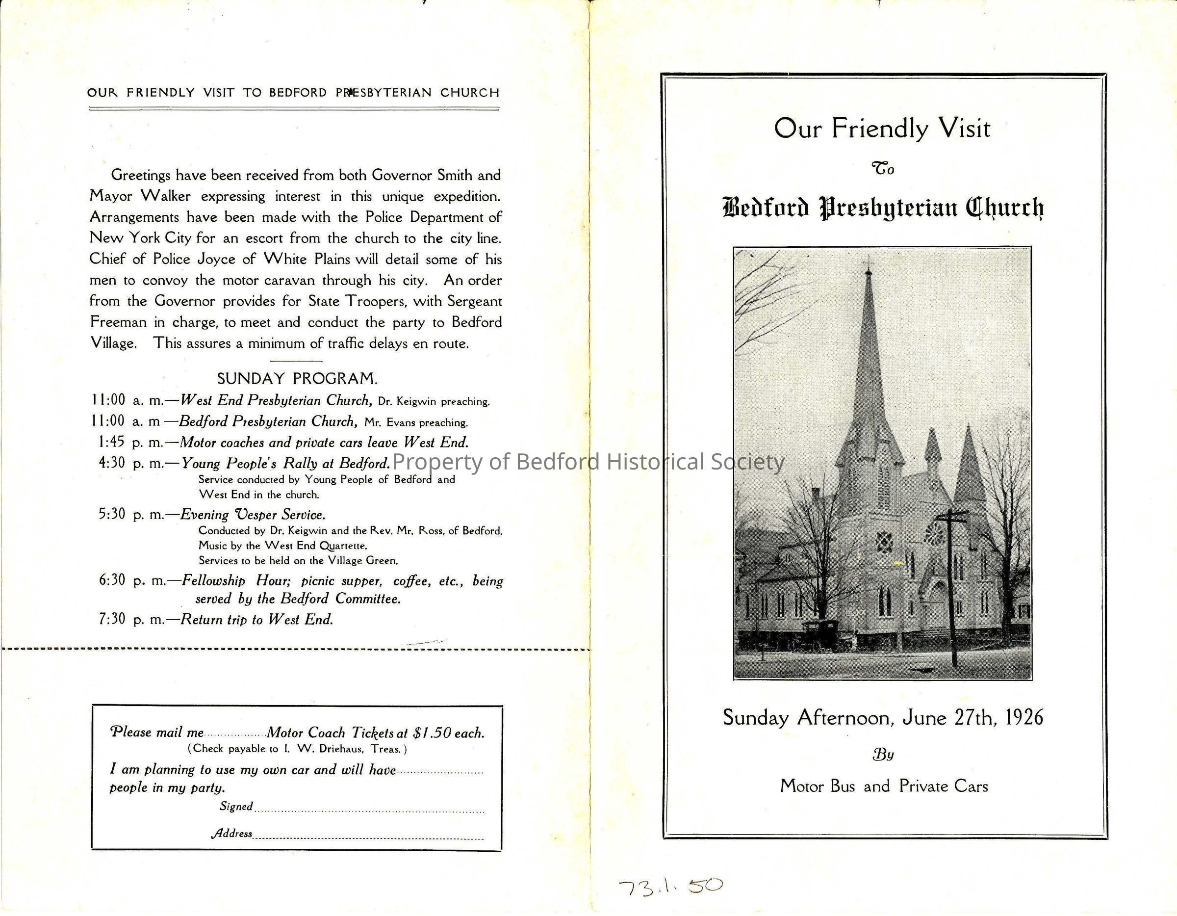 Pamphlet advertising a planned trip to the Bedford Presbyterian Church, June 27, 1926