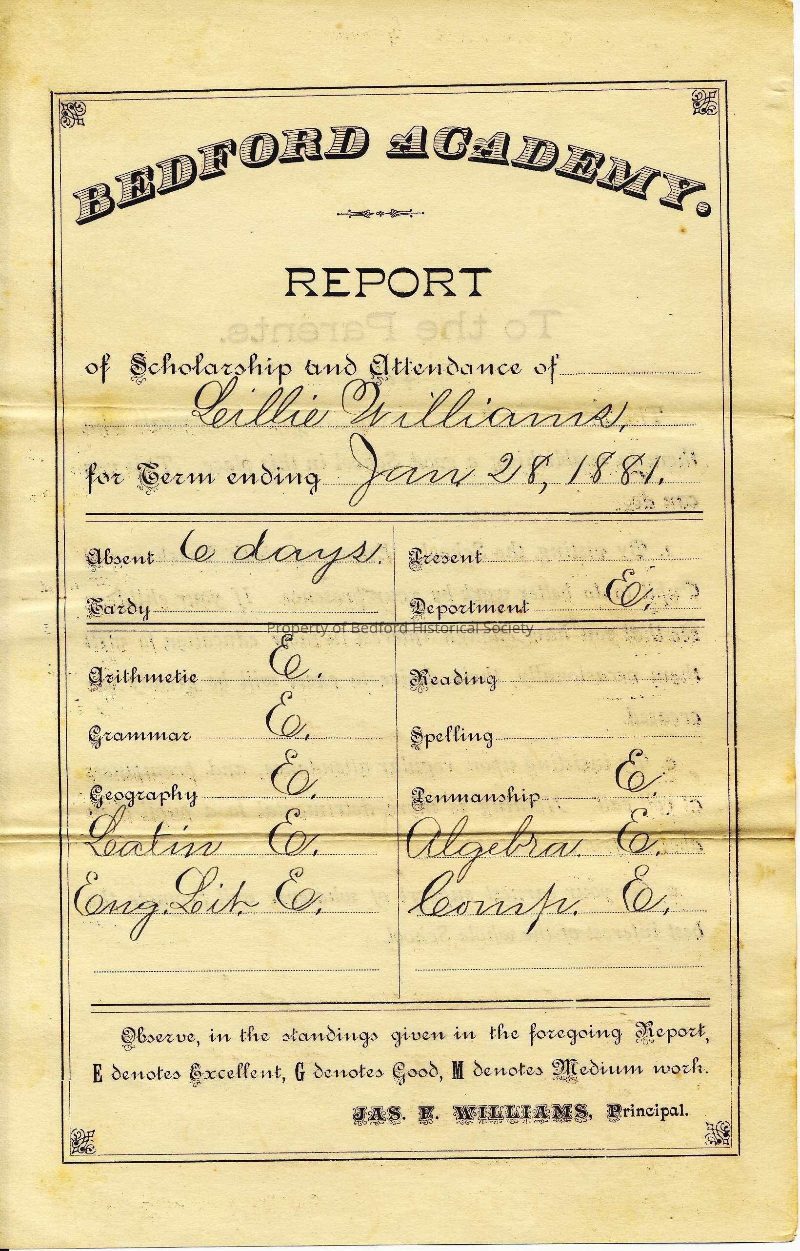 Her report card from the Bedford Academy (now the Bedford Free Library).