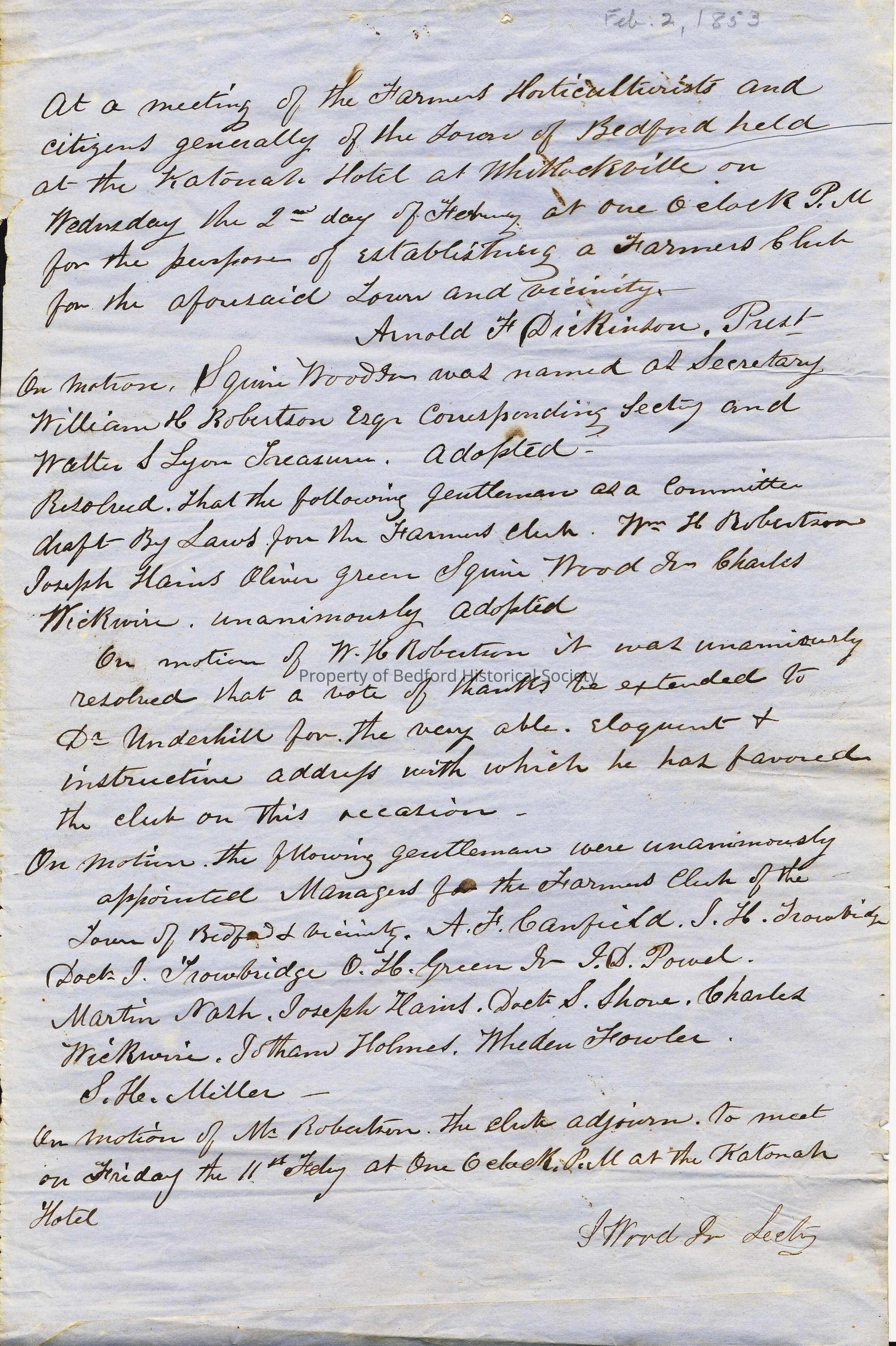 Minutes of the meeting which established the Bedford Farmers' Club, Feb. 2, 1853