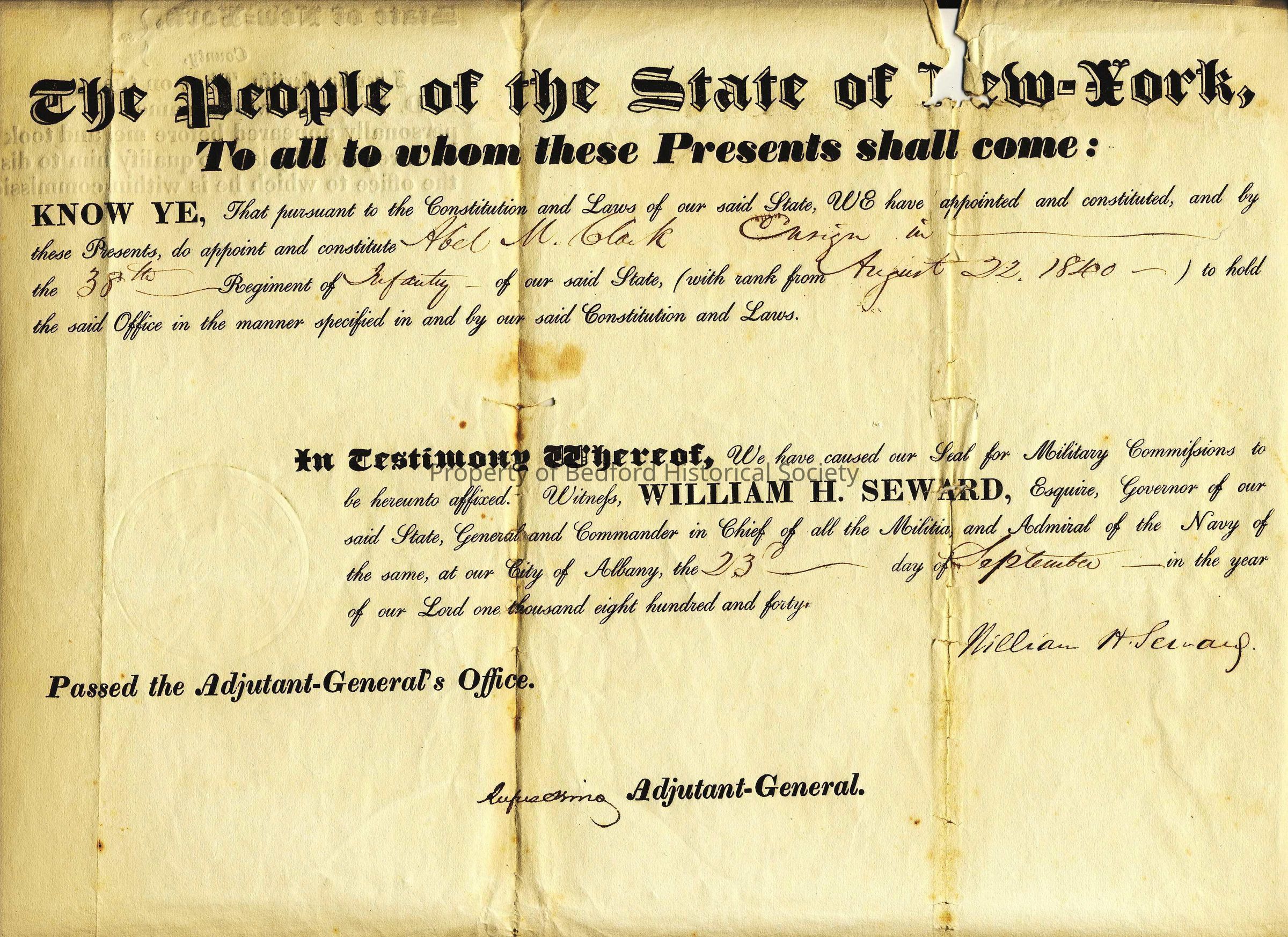 Commission as Ensign for Abel M. Clark in the New York State Militia, 1840 *transcription in the Transcriptions Binder