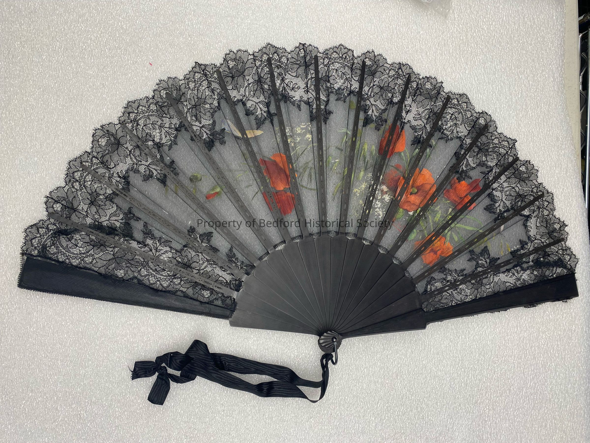 Lace and silk? Black fan with red poppy design and ribbon attached