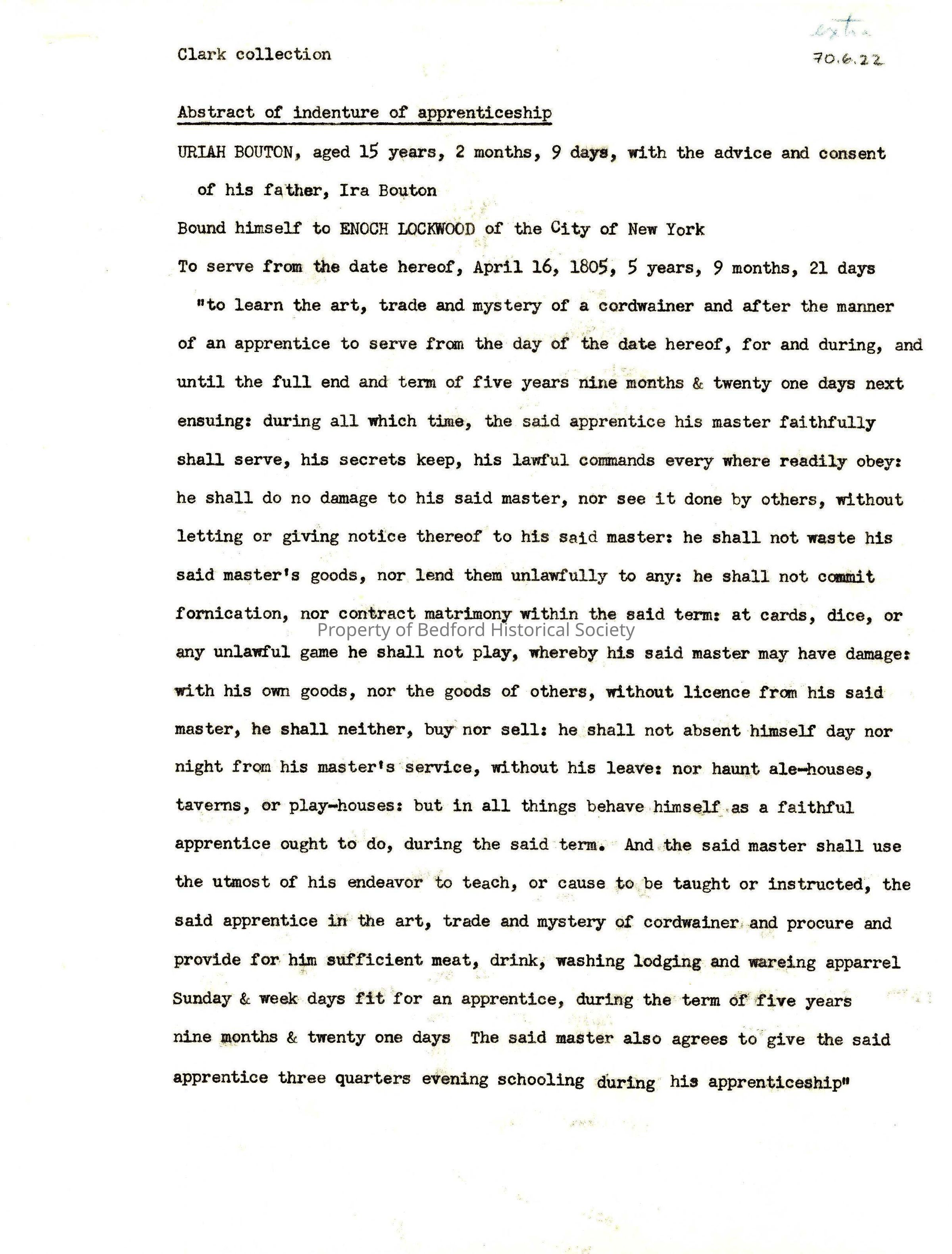 Abstract of indenture of apprenticeship of Uriah Bouton to Enoch Lockwood in the occupation of Cordwainer