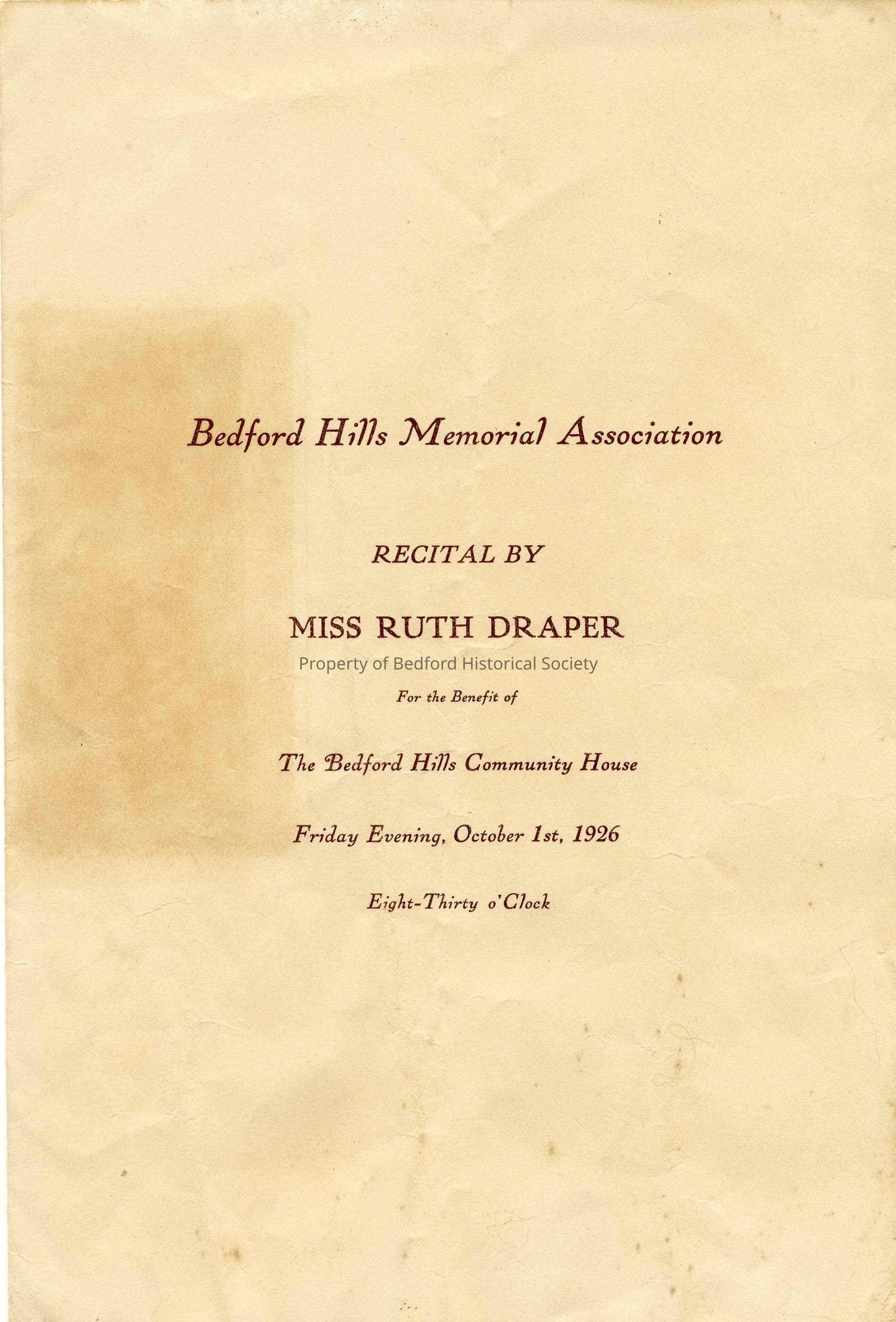 Bedford Hills Memorial Association Recital by Miss Ruth Draper, 1926