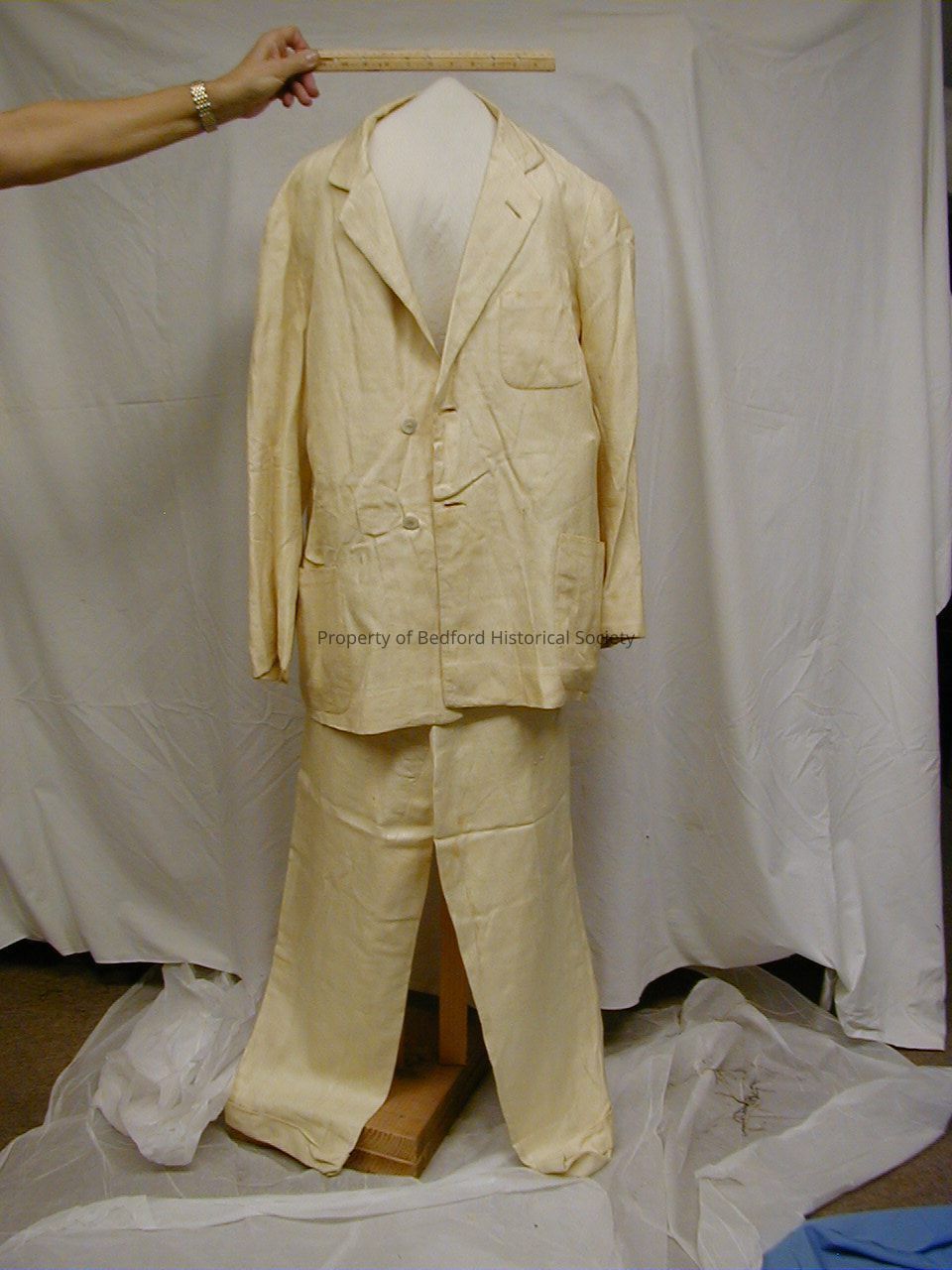 Cream silk/linen single breasted suit with notched lapel and patch pockets. Label: Capellini, Venezia.