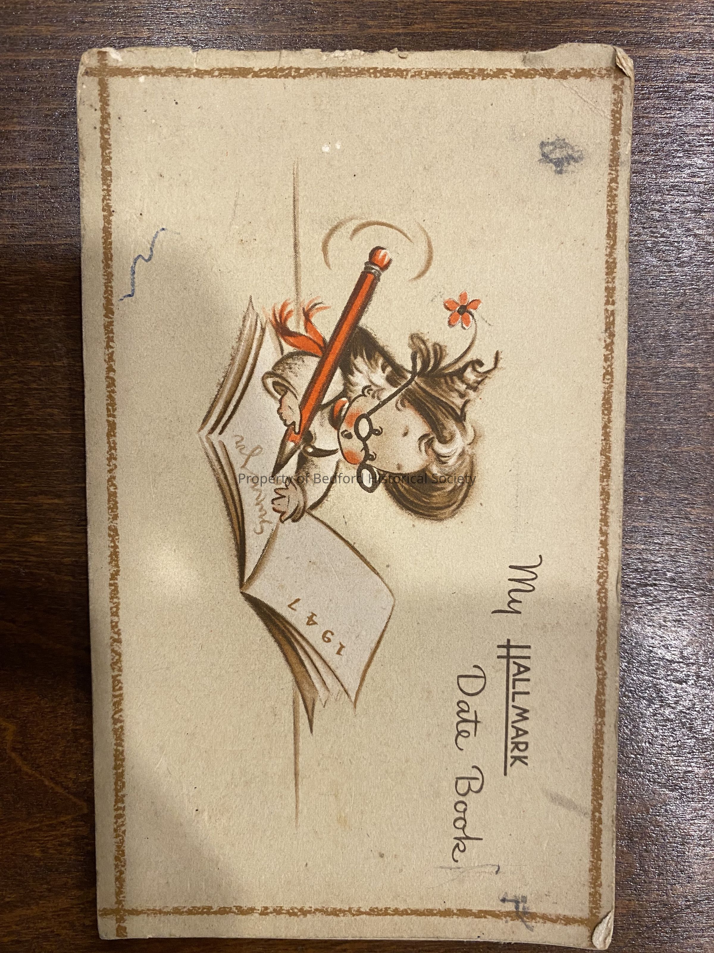 Inside has monthly calendars for year 1947 as well as hand written writing with various people and addresses