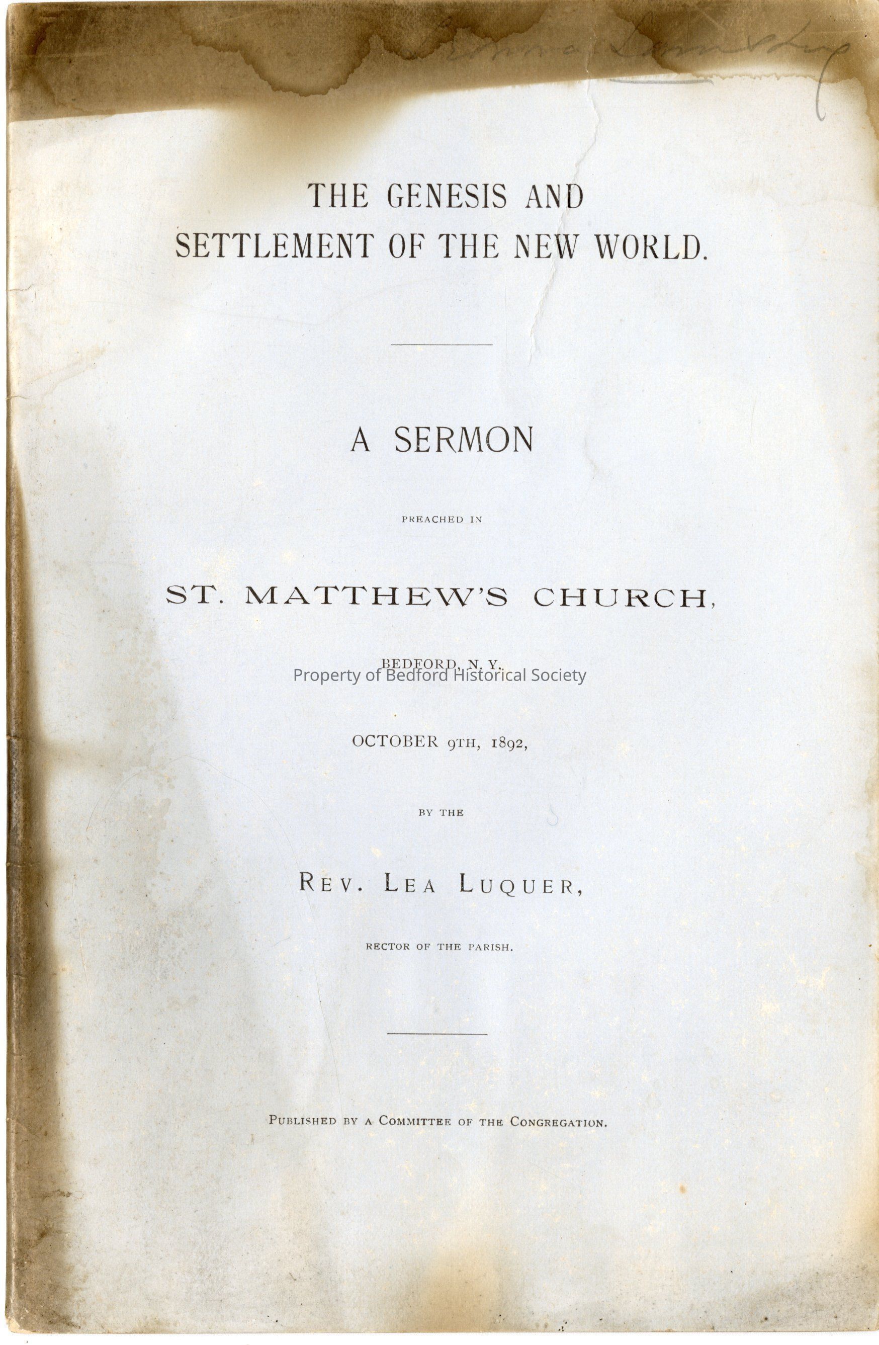 The Genesis and Settlement of the New World. A Sermon preached in St. Mathew's Church, Bedford, N.Y. October 9th, 1892 by the Rev. Lea Luquer Rector of the Parish, Pulplished by a Committee of the Congration