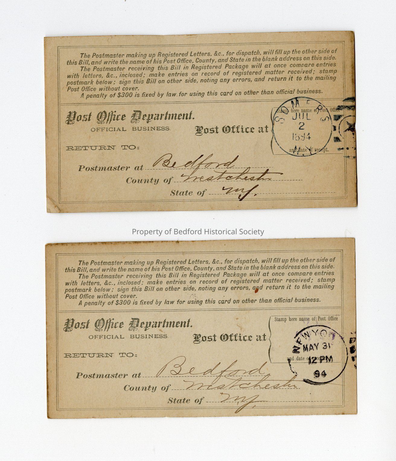 Two Post Office registry bills sent from Bedford, New York from (?) Purcell. First from July 2, 1894 to Somers, New York, the second from May 31, 1894 to New York City
