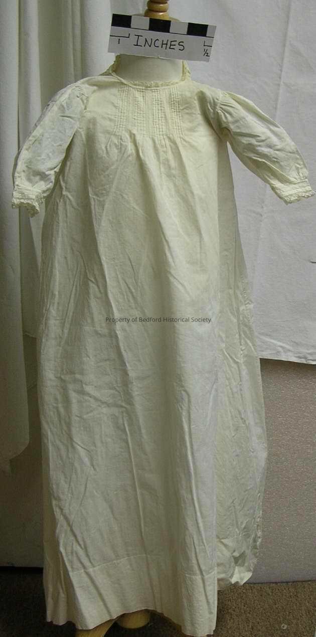 Infant's long dress, late 19th century, lace ruffle at neck, front bodice with vertical tucks alternating with rows of feather stitching, very good condition