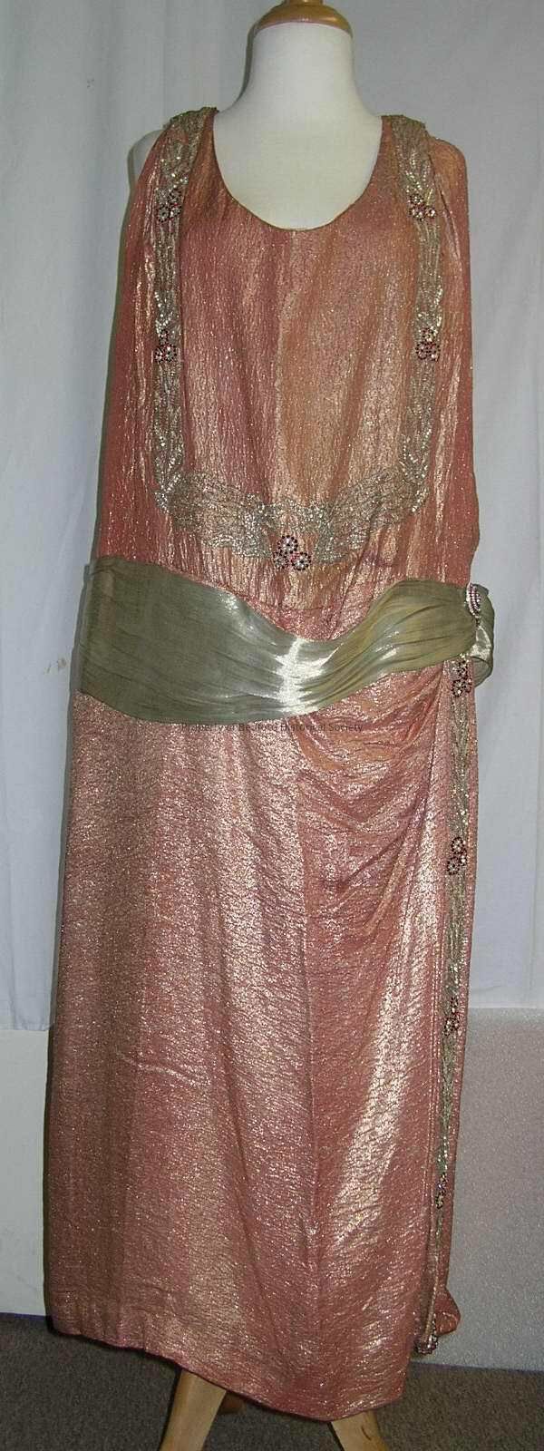 Evening Dress, circa 1926, large size, peach/pink/silver crinkle textured lame sleeveless chemise dress trimmed down the sides of the bodice, across the waist and down the side of the skirt with fine silver metallic folliate embroidery, with flowers of ruby and clear rhinestones, cloth of silver sash with ruby and rhinestones set buckle, very good condition. Worn by Mrs. George R. Barse, wife of the artist George R. Barse N.A.