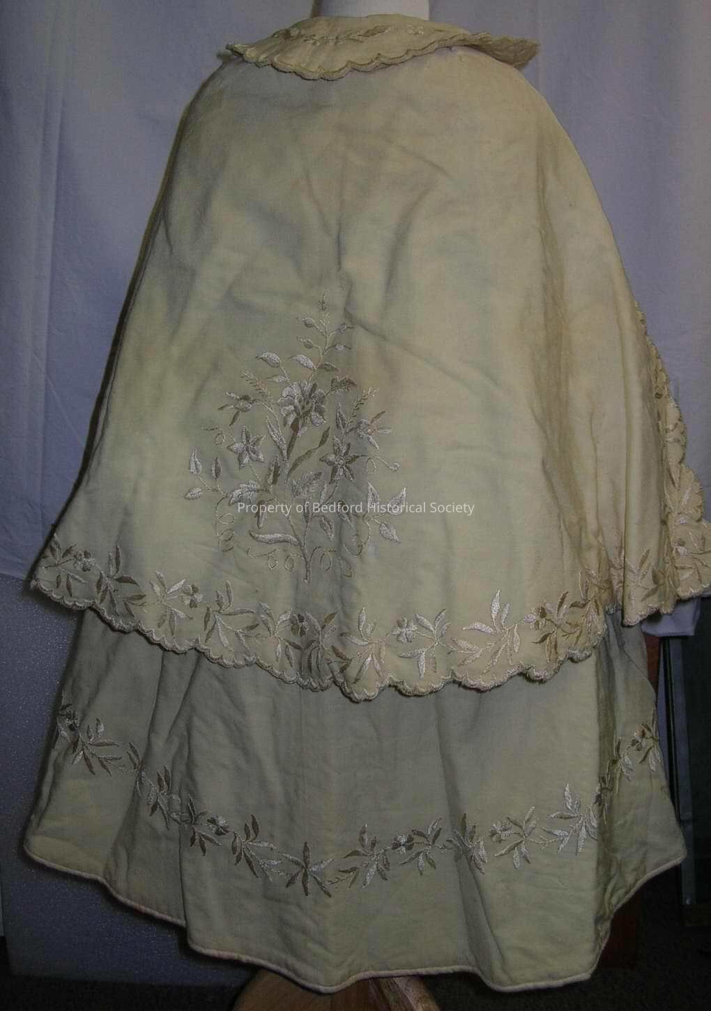 Mrs. Florence R. Cox child's cape, late 19th century, ivory wool flannel embroidered with flowering vines, small collar, waist cape.