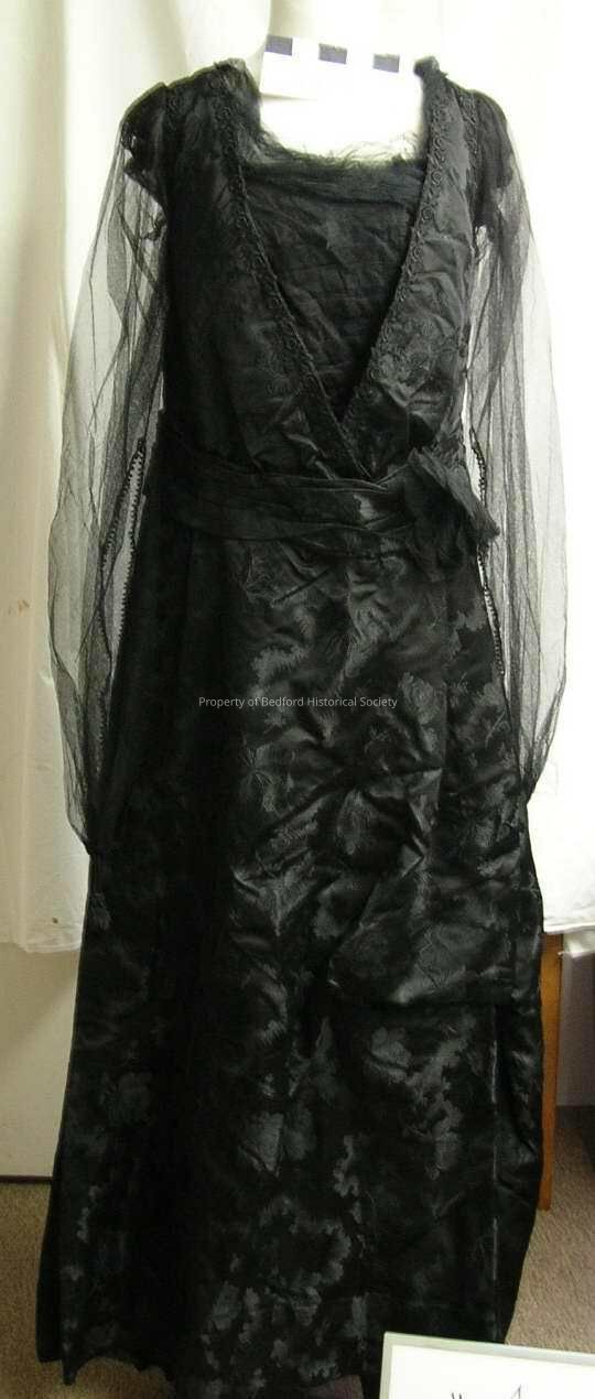 Evening dress, 1910, black patterned silk with V neck insert and long sleeves of black silk tulle, in good condition.