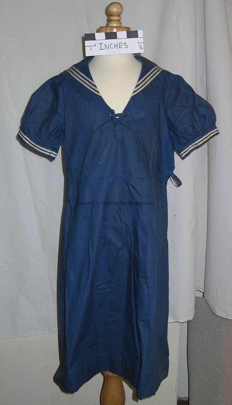Sailor dress, 1930s, navy cotton with three rows of cream flat braid at the sailor collar, label: Little Dorothy Dresses size 12, missing snap in placket, open down one sleeve and side.