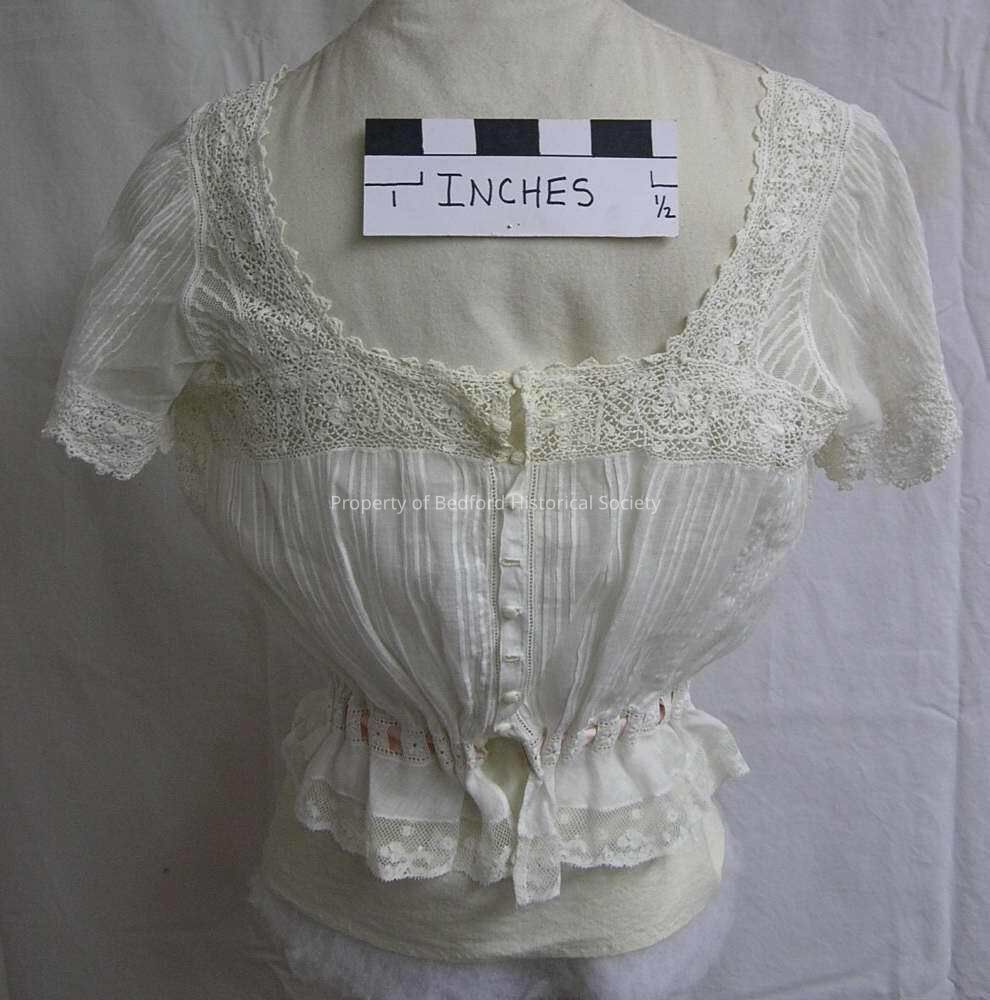 Lingerie bodice, with square neck and short sleeves, ornamented with bands of Irish crochet, trios of hand pin tucks, embroidered tape for beading (ribbon missing) slight peplum at waist. Somewhat unusual since it has sleeves. Looks like a nightgown bodice, but has a finished hem.