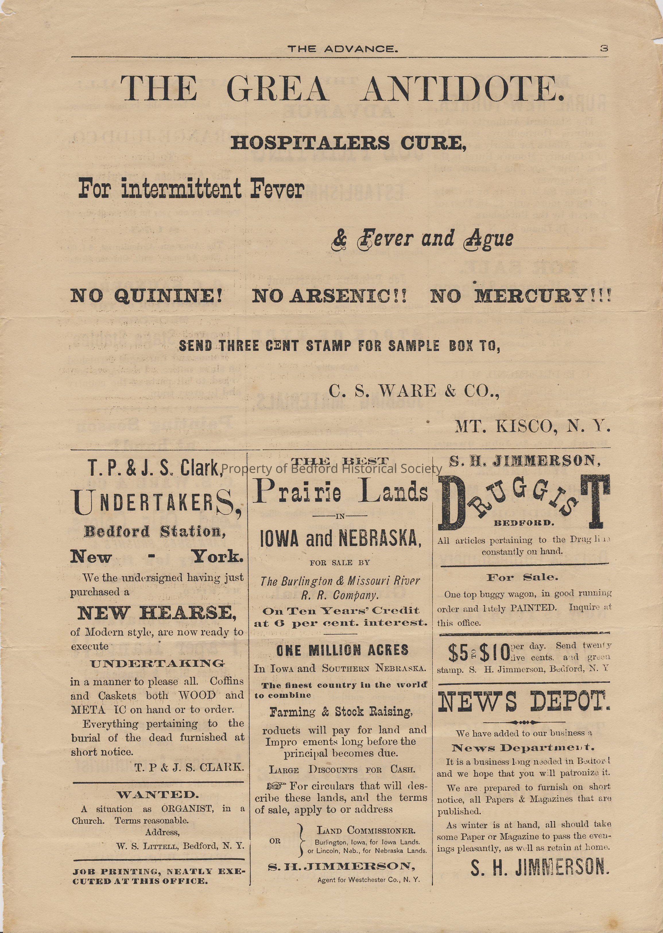 Advertisement page from The Advance magazine featuring a small advertisement for T.P & J.S. Clark Undertakers, Bedford Station, NY