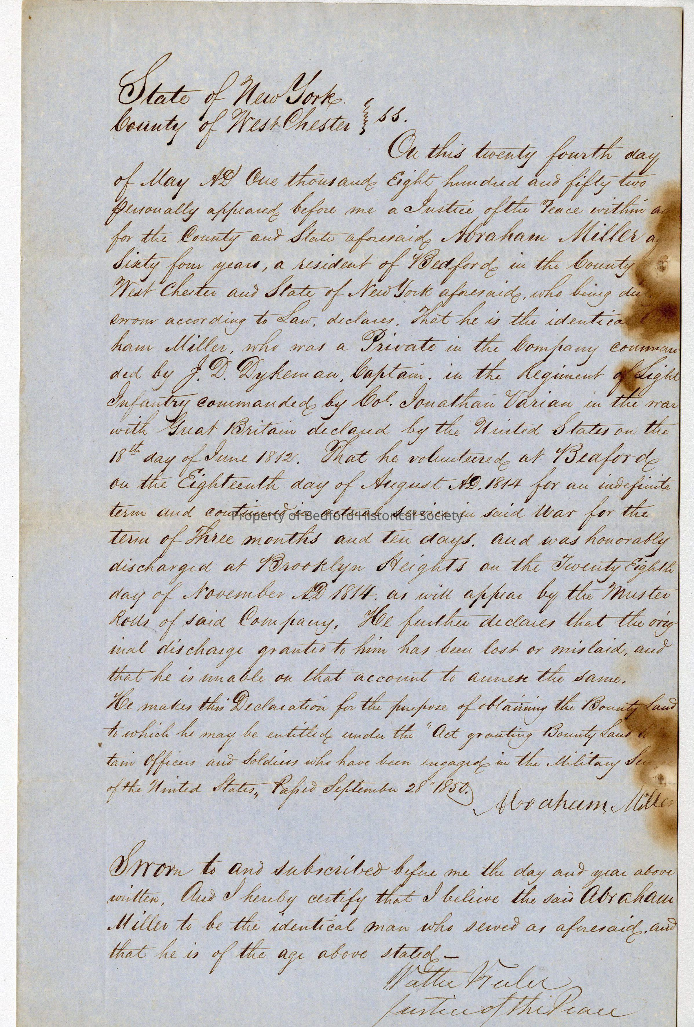 Affidavit by Abraham Miller re service in War of 1812, May 24, 1852