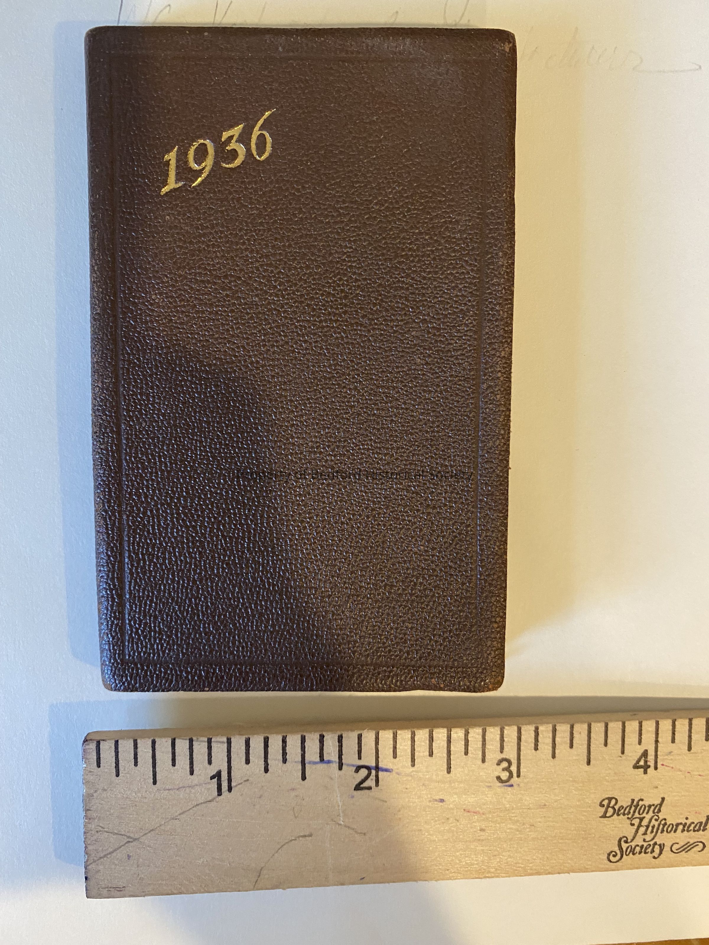 Brown agenda book, 1936 on cover From box found in Historical Hall with things from a Ruth A. Parkinson 4 1/8" L x 2 5/8" W