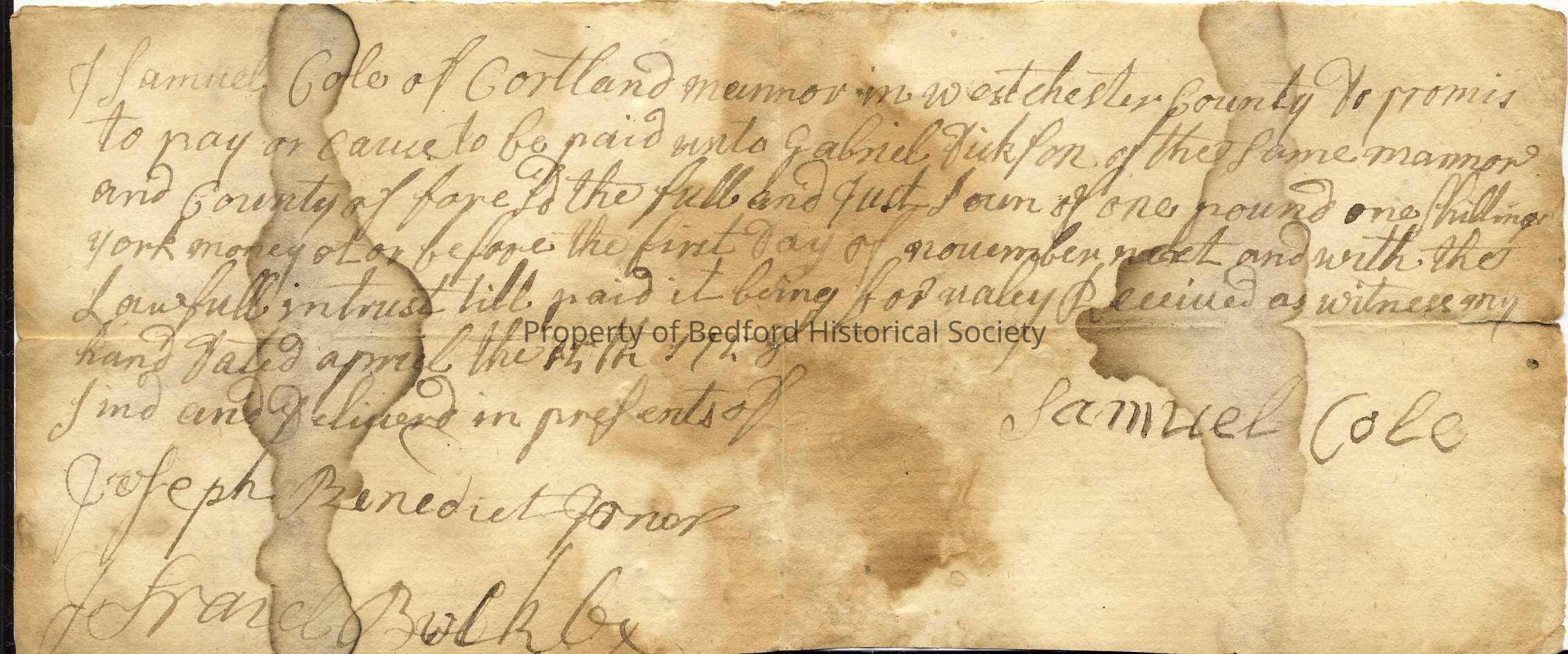 Agreement of debt to Gabriel Dickson from Samuel Cole of Cortlandt Manor