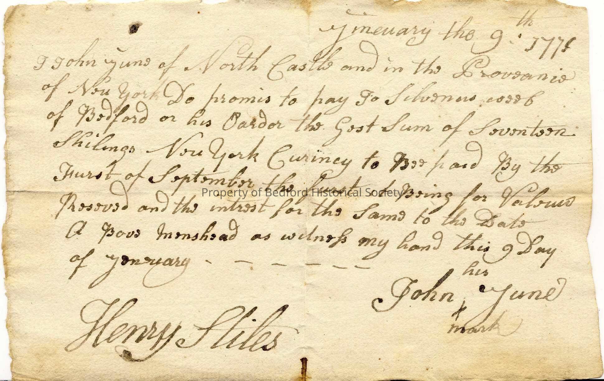 Agreement of debt to Silvanus ? from John Yune, 1771 (?)