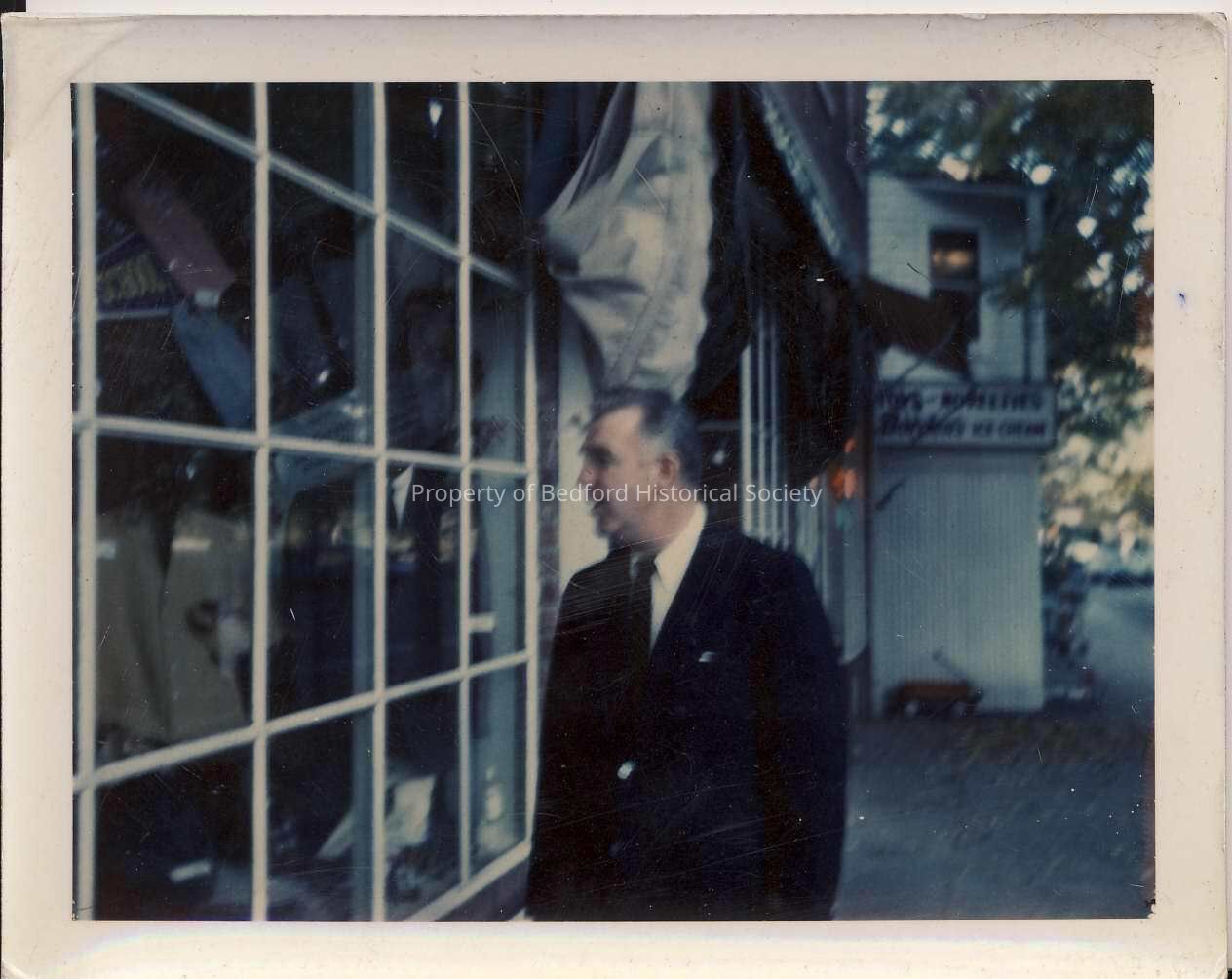Albert Glasser looking in the window of Glasser Brothers in Bedford Village