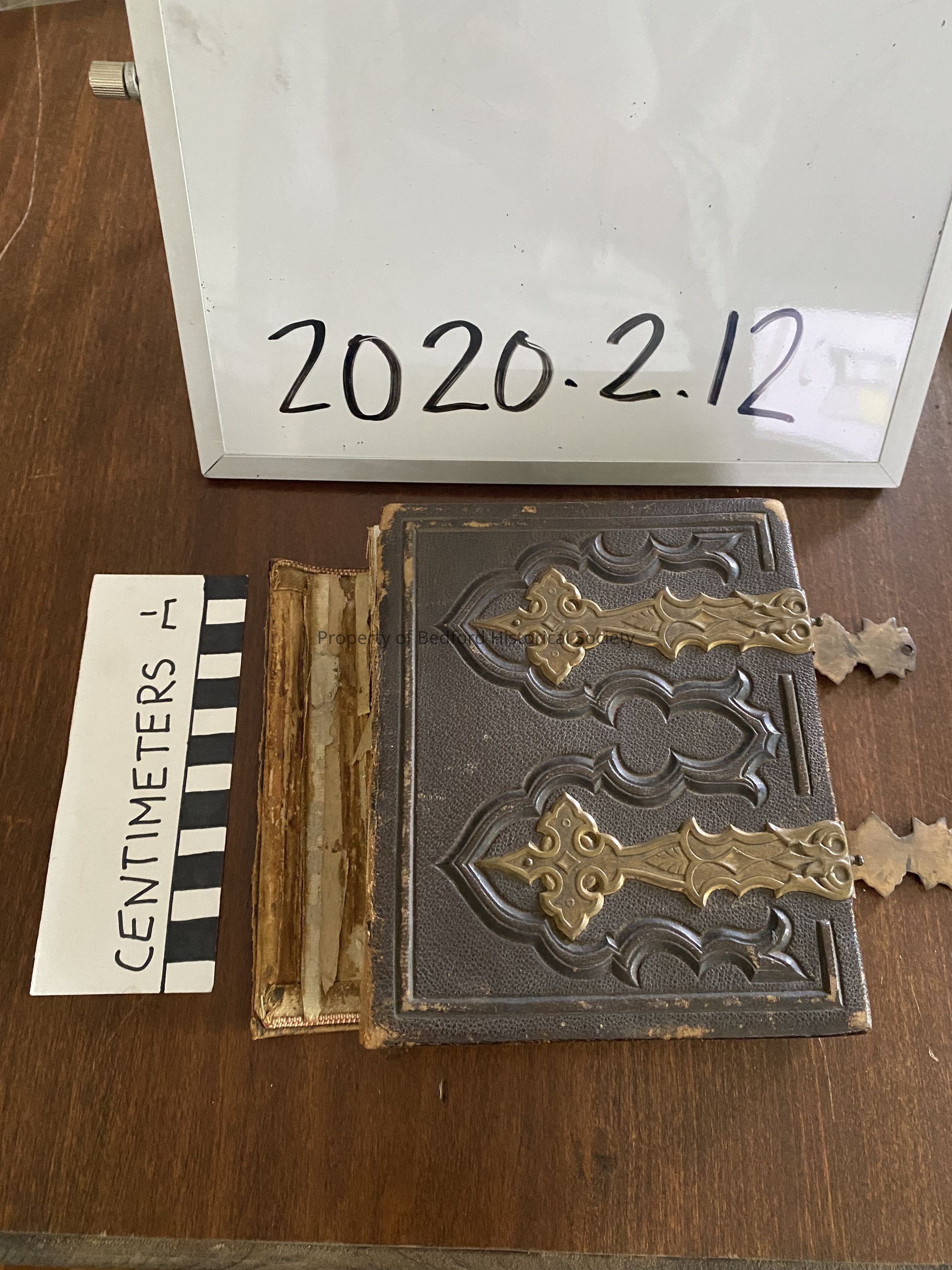 brown leather bound album with brass clasps containing carte-de-visite photographs of Reverand P.B. Heroy, Mrs. Heroy Mrs. A. Mead Clark, C.C. Hoyt