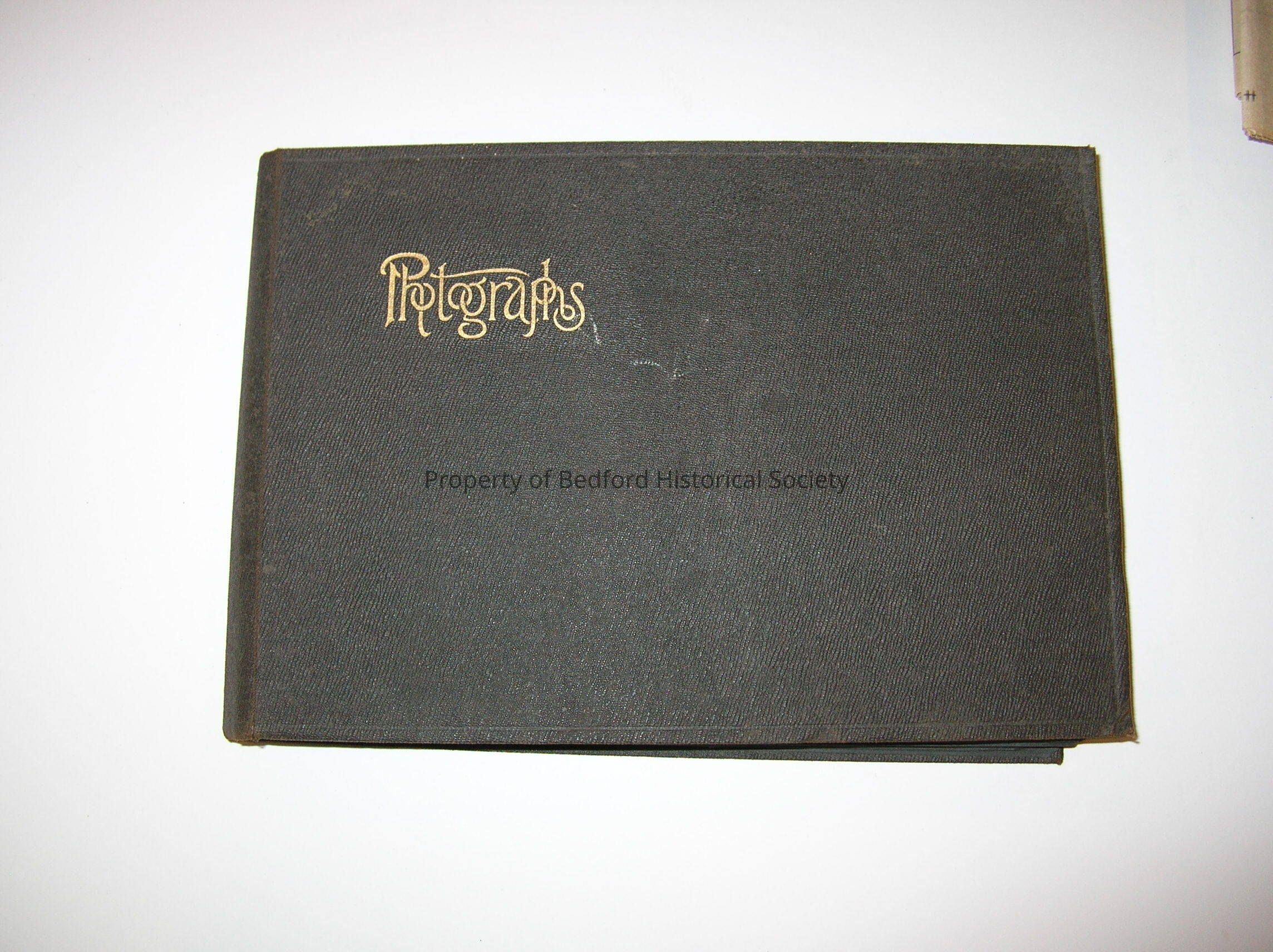 Black leather Marsh Family photo album, with gold lettering on the cover reading: Photographs.