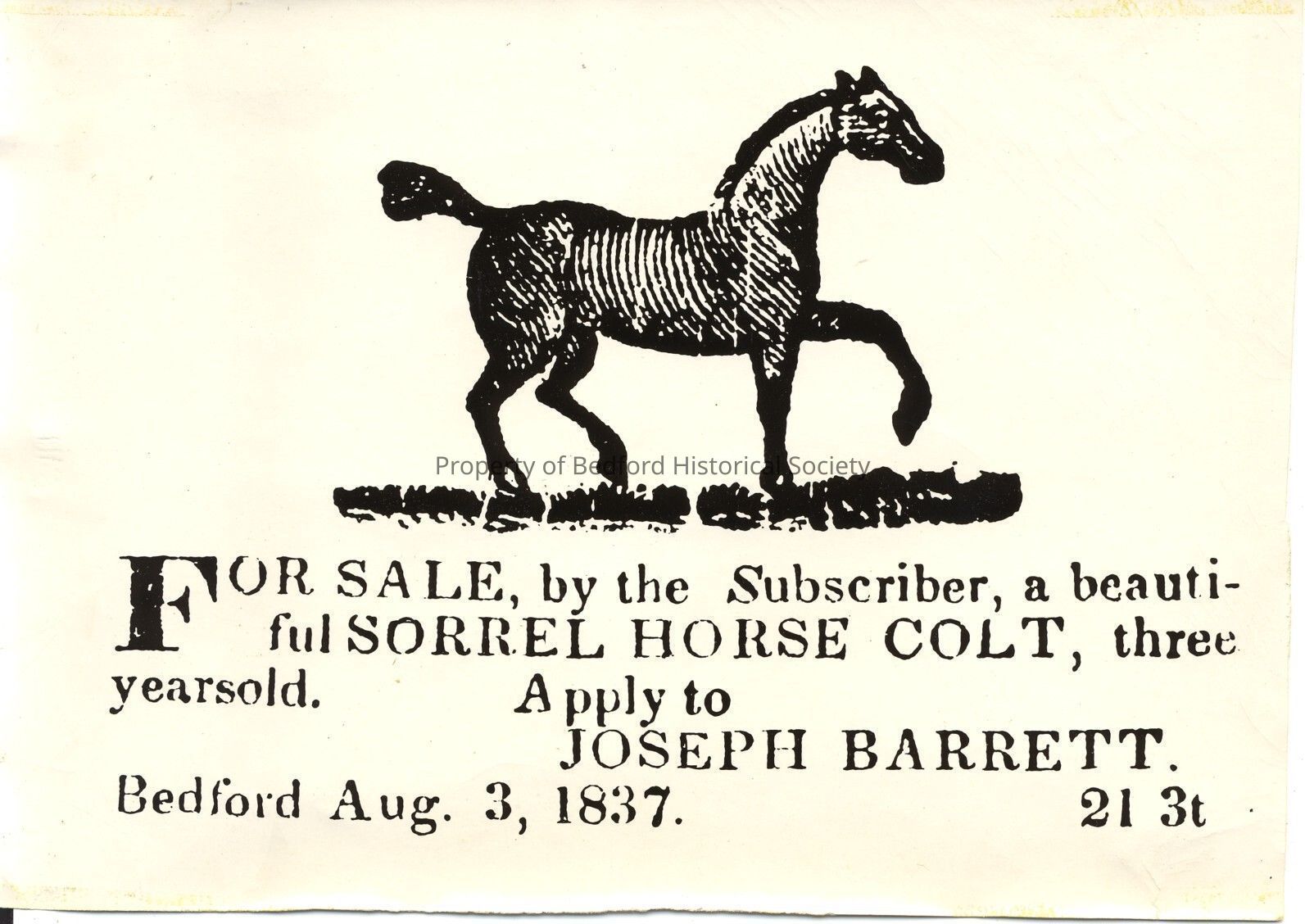 Sorrel Horse Colt, For Sale Announcement. Bedford. Aug. 3, 1837