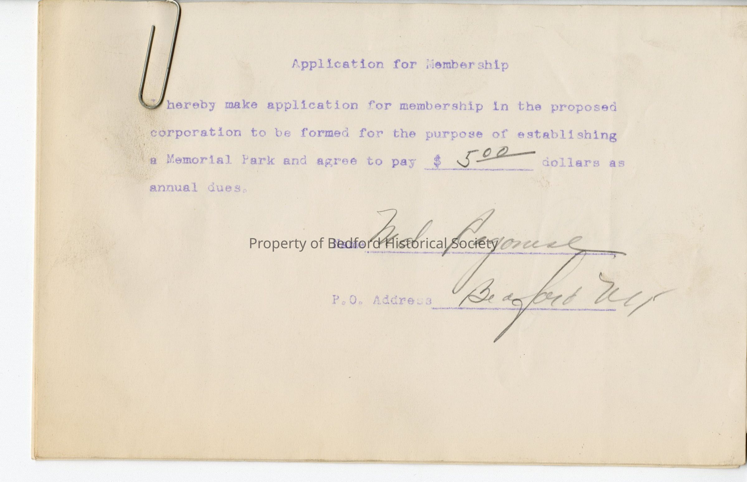 Application for membership slips for establishment of Bedford Memorial Park, and aggreement to pay annual dues of 5.00 USD