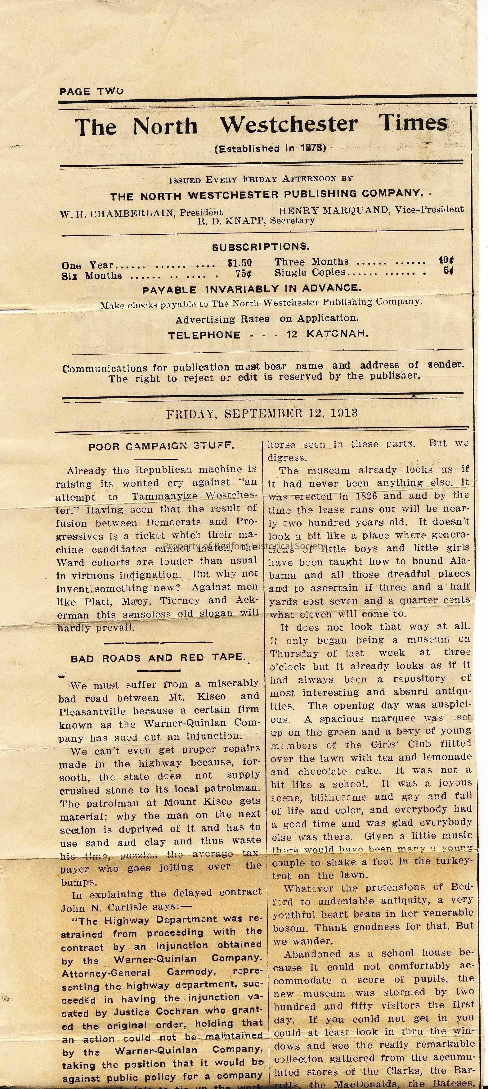 -"Good Old Bedford," The North Westchester Times, Sept. 12, 1913 (original and copy)
