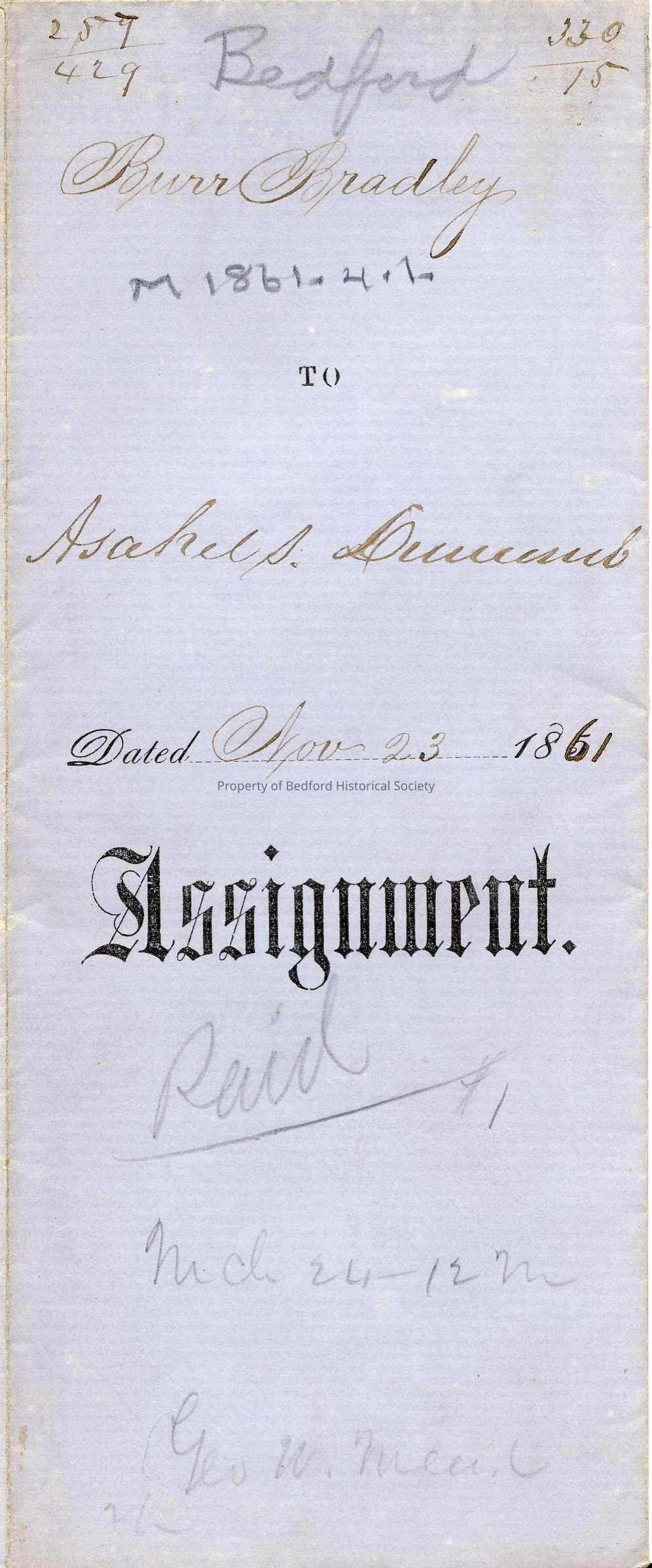 Assignment: Burr Bradley to Isabel S. Duncomb, 1861