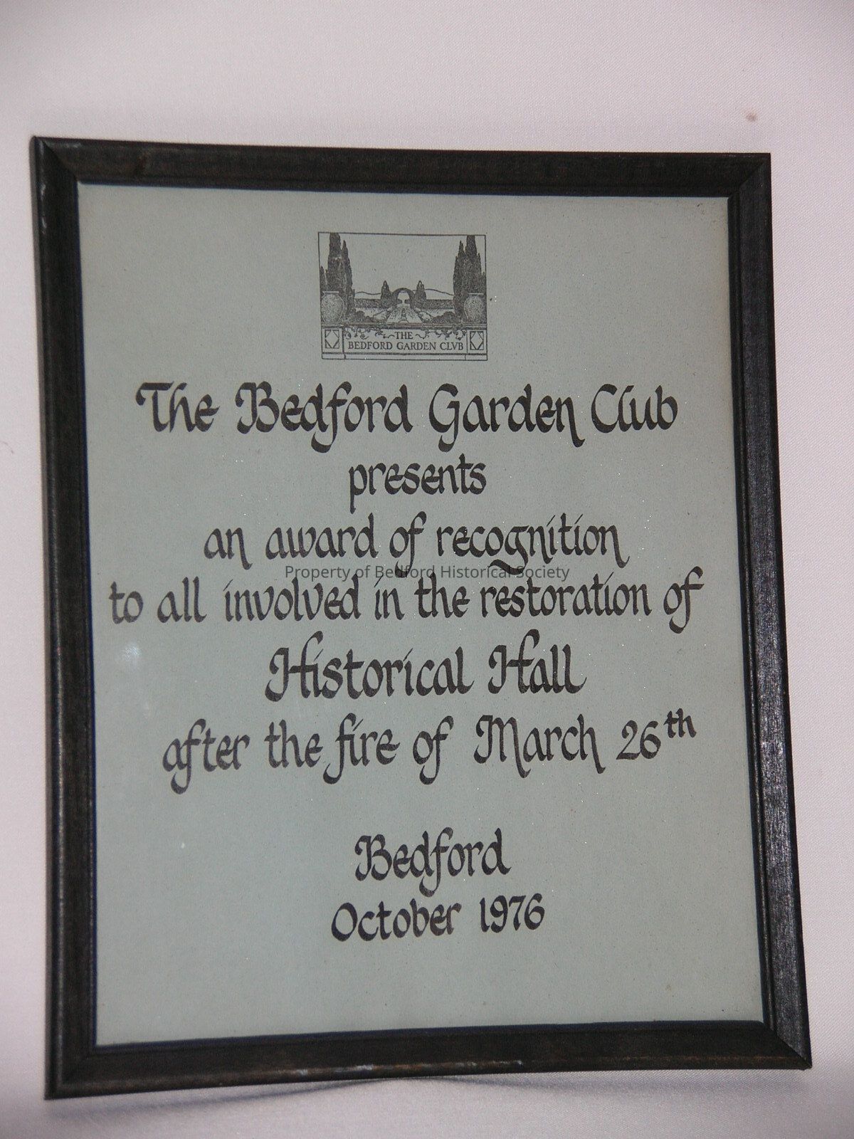 Award of recognition for helping in the restoration of Historical Hall from the Bedfrod Garden Club in 1976.