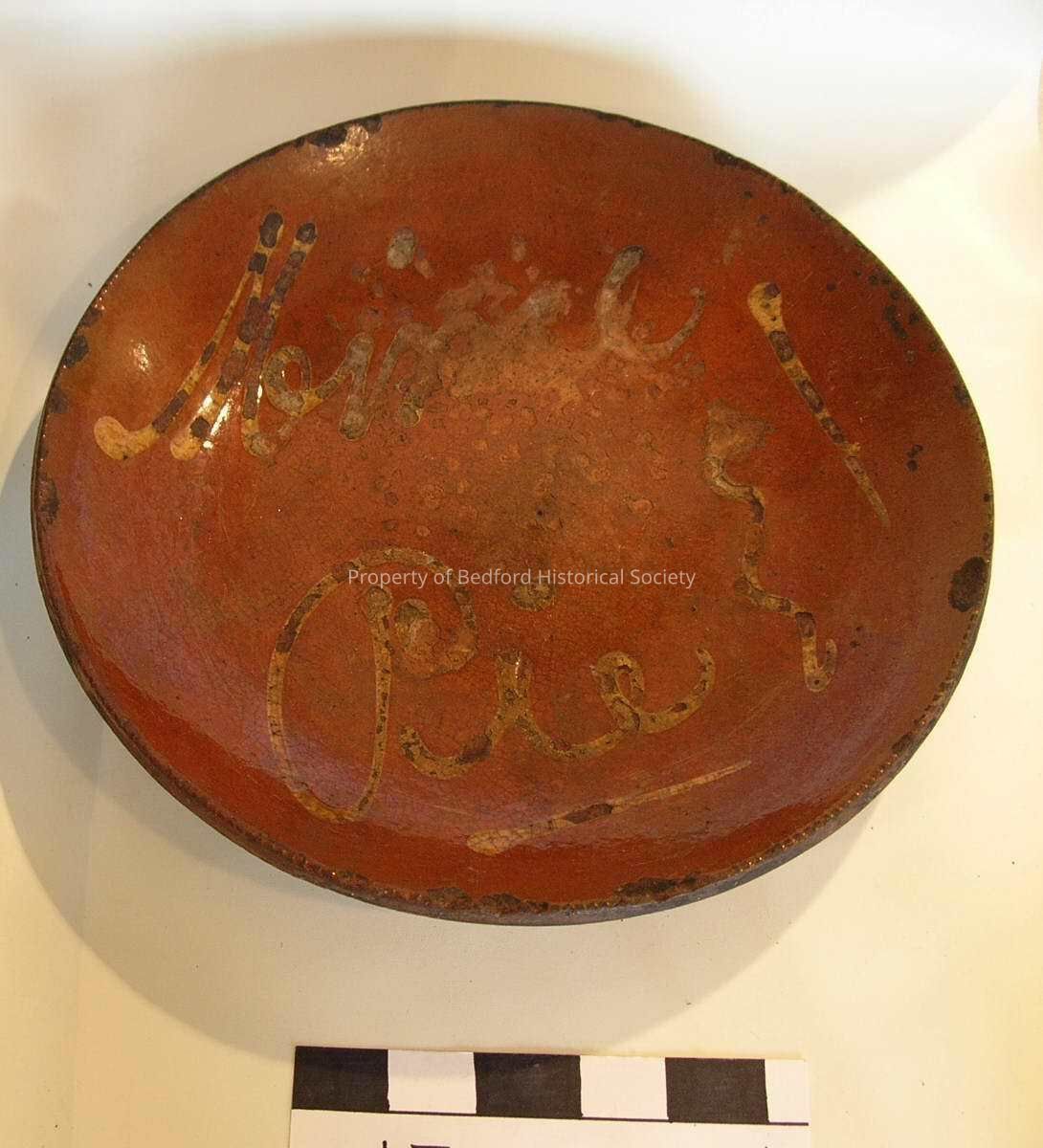 Red Slipware pie platter, "mince pie"